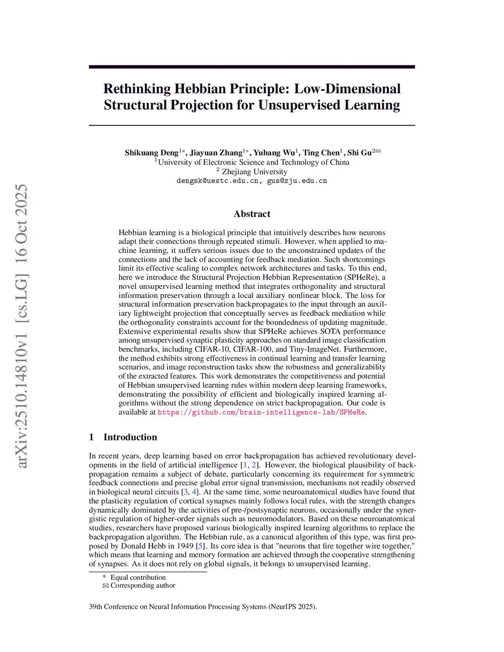 Rethinking Hebbian Principle: Low-Dimensional Structural Projection for Unsupervised Learning