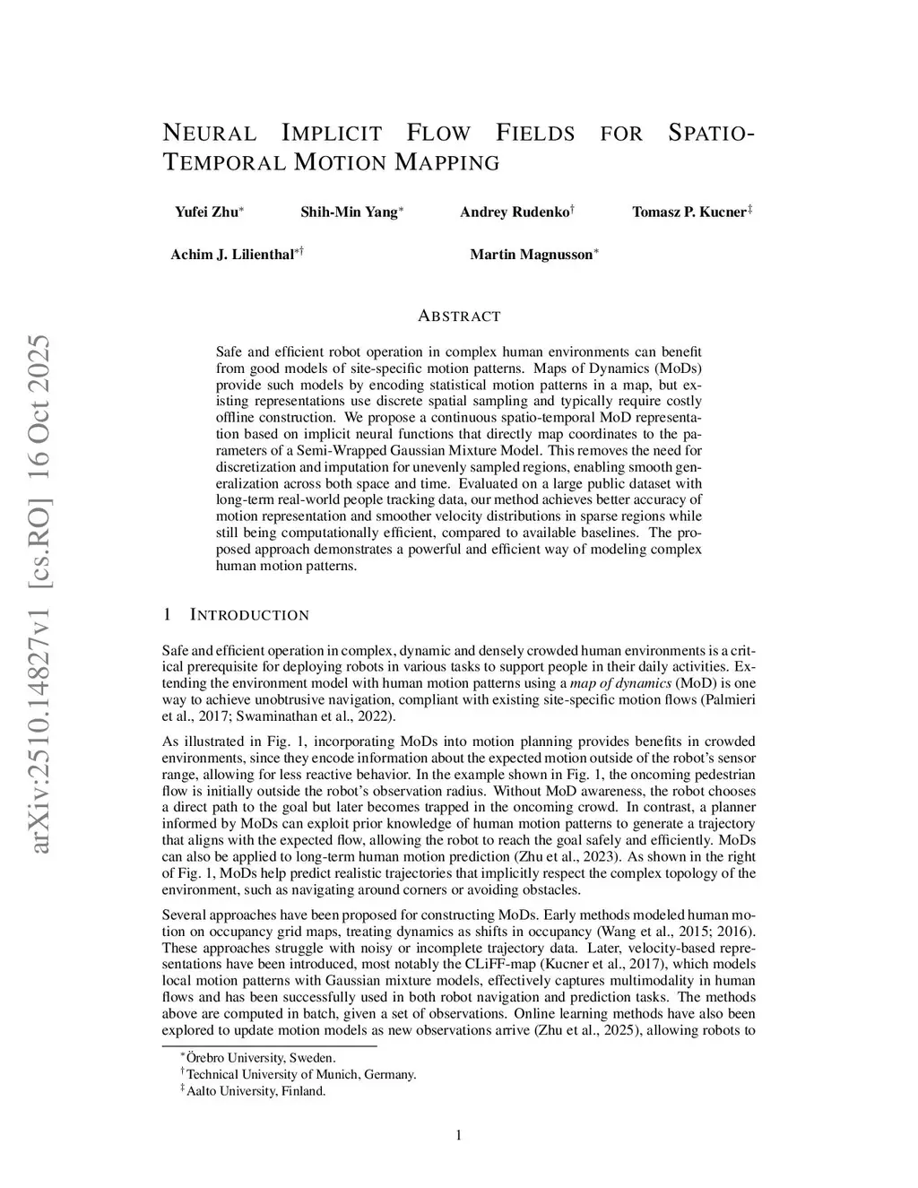 Safe and efficient robot operation in complex human environments can benefit from good models of site-specific motion patterns. Maps of Dynamics (MoDs) provide such models by encoding statistical motion patterns in a map, but existing representations use discrete spatial sampling and typically require costly offline construction. We propose a continuous spatio-temporal MoD representation based on implicit neural functions that directly map coordinates to the parameters of a Semi-Wrapped Gaussian Mixture Model. This removes the need for discretization and imputation for unevenly sampled regions, enabling smooth generalization across both space and time. Evaluated on two public datasets with real-world people tracking data, our method achieves better accuracy of motion representation and smoother velocity distributions in sparse regions while still being computationally efficient, compared to available baselines. The proposed approach demonstrates a powerful and efficient way of modeling complex human motion patterns and high performance in the trajectory prediction downstream task. Project code is available atthis https URL