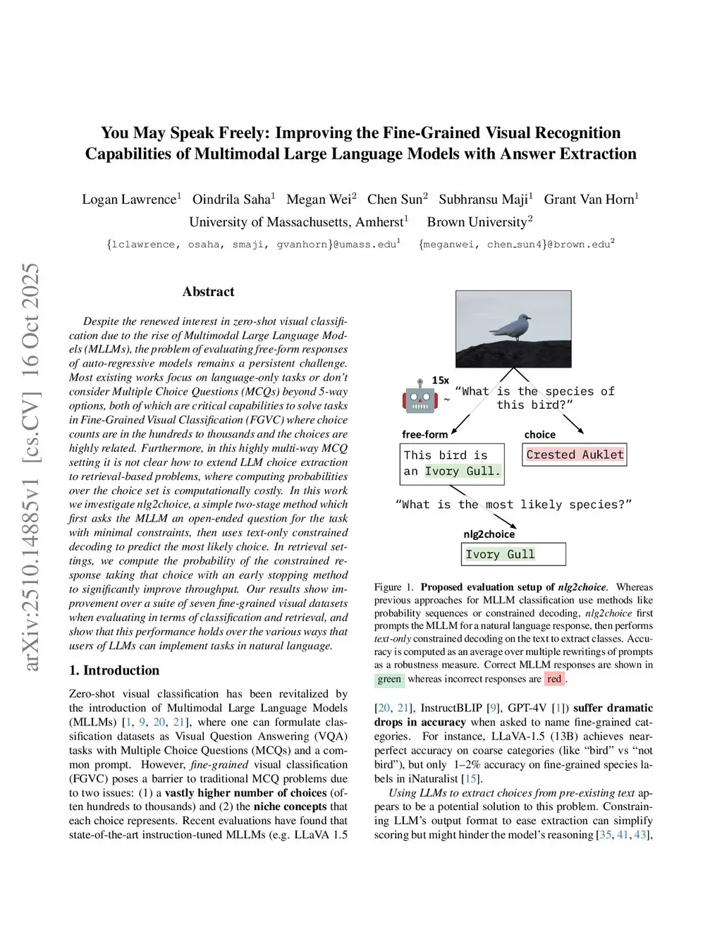 Despite the renewed interest in zero-shot visual classification due to the rise of Multimodal Large Language Models (MLLMs), the problem of evaluating free-form responses of auto-regressive models remains a persistent challenge. Most existing works focus on language-only tasks or don't consider Multiple Choice Questions (MCQs) beyond 5-way options, both of which are critical capabilities to solve tasks in Fine-Grained Visual Classification (FGVC) where choice counts are in the hundreds to thousands and the choices are highly related. Furthermore, in this highly multi-way MCQ setting it is not clear how to extend LLM choice extraction to retrieval-based problems, where computing probabilities over the choice set is computationally costly. In this work we investigate nlg2choice, a simple two-stage method which first asks the MLLM an open-ended question for the task with minimal constraints, then uses text-only constrained decoding to predict the most likely choice. In retrieval settings, we compute the probability of the constrained response taking that choice with an early stopping method to significantly improve throughput. Our results show improvement over a suite of seven fine-grained visual datasets when evaluating in terms of classification and retrieval, and show that this performance holds over the various ways that users of LLMs can implement tasks in natural language.
