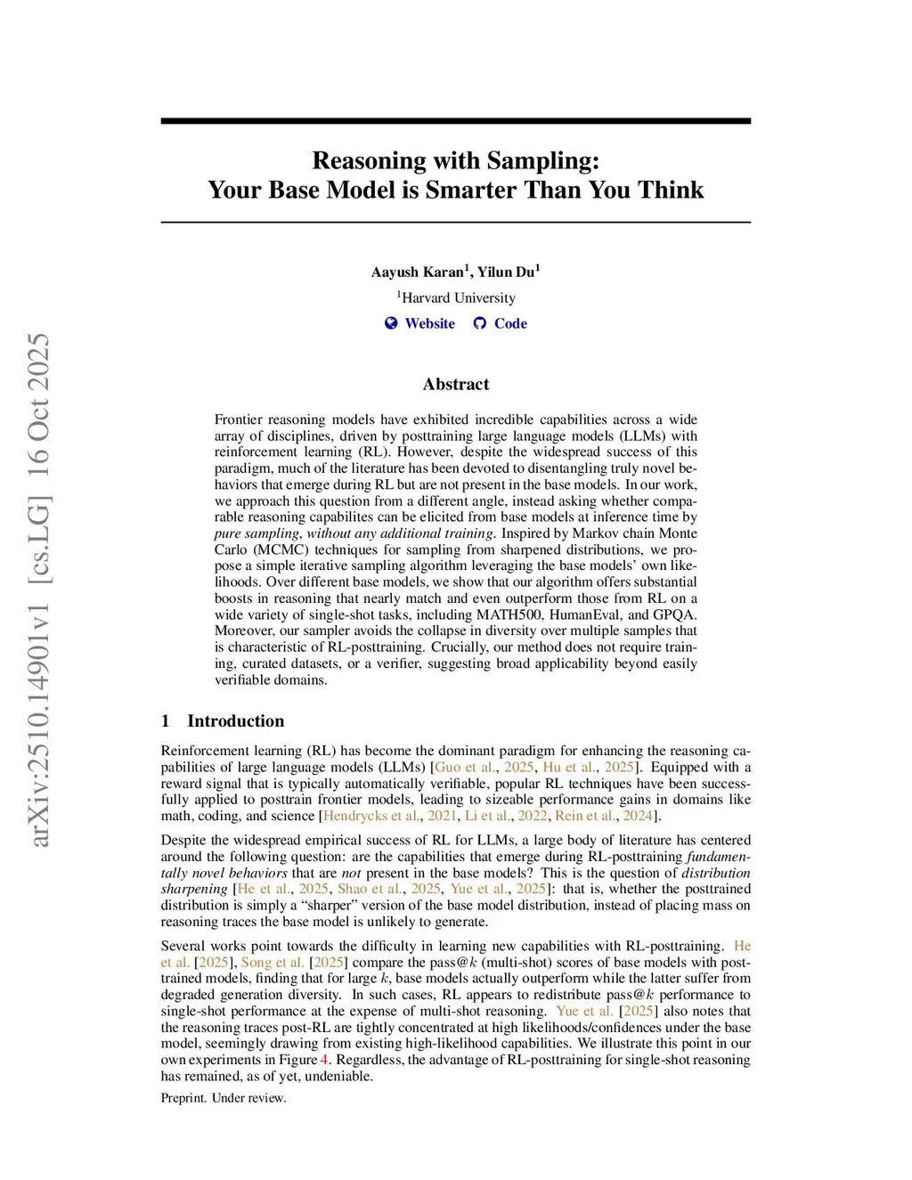 Reasoning with Sampling: Your Base Model is Smarter Than You Think