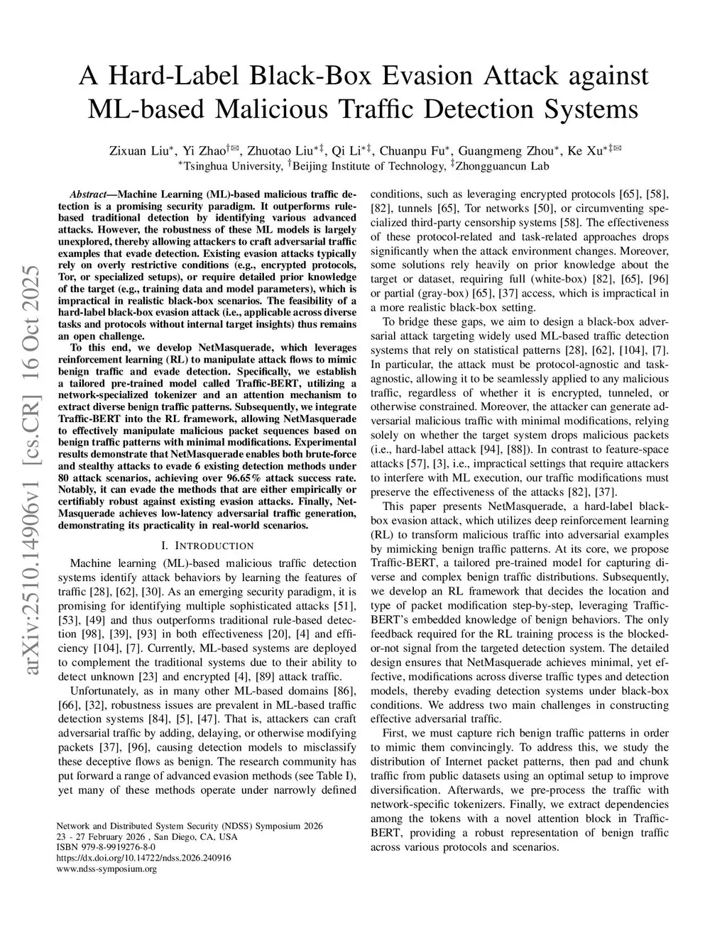 Machine Learning (ML)-based malicious traffic detection is a promising security paradigm. It outperforms rule-based traditional detection by identifying various advanced attacks. However, the robustness of these ML models is largely unexplored, thereby allowing attackers to craft adversarial traffic examples that evade detection. Existing evasion attacks typically rely on overly restrictive conditions (e.g., encrypted protocols, Tor, or specialized setups), or require detailed prior knowledge of the target (e.g., training data and model parameters), which is impractical in realistic black-box scenarios. The feasibility of a hard-label black-box evasion attack (i.e., applicable across diverse tasks and protocols without internal target insights) thus remains an open challenge. To this end, we develop NetMasquerade, which leverages reinforcement learning (RL) to manipulate attack flows to mimic benign traffic and evade detection. Specifically, we establish a tailored pre-trained model called Traffic-BERT, utilizing a network-specialized tokenizer and an attention mechanism to extract diverse benign traffic patterns. Subsequently, we integrate Traffic-BERT into the RL framework, allowing NetMasquerade to effectively manipulate malicious packet sequences based on benign traffic patterns with minimal modifications. Experimental results demonstrate that NetMasquerade enables both brute-force and stealthy attacks to evade 6 existing detection methods under 80 attack scenarios, achieving over 96.65% attack success rate. Notably, it can evade the methods that are either empirically or certifiably robust against existing evasion attacks. Finally, NetMasquerade achieves low-latency adversarial traffic generation, demonstrating its practicality in real-world scenarios.