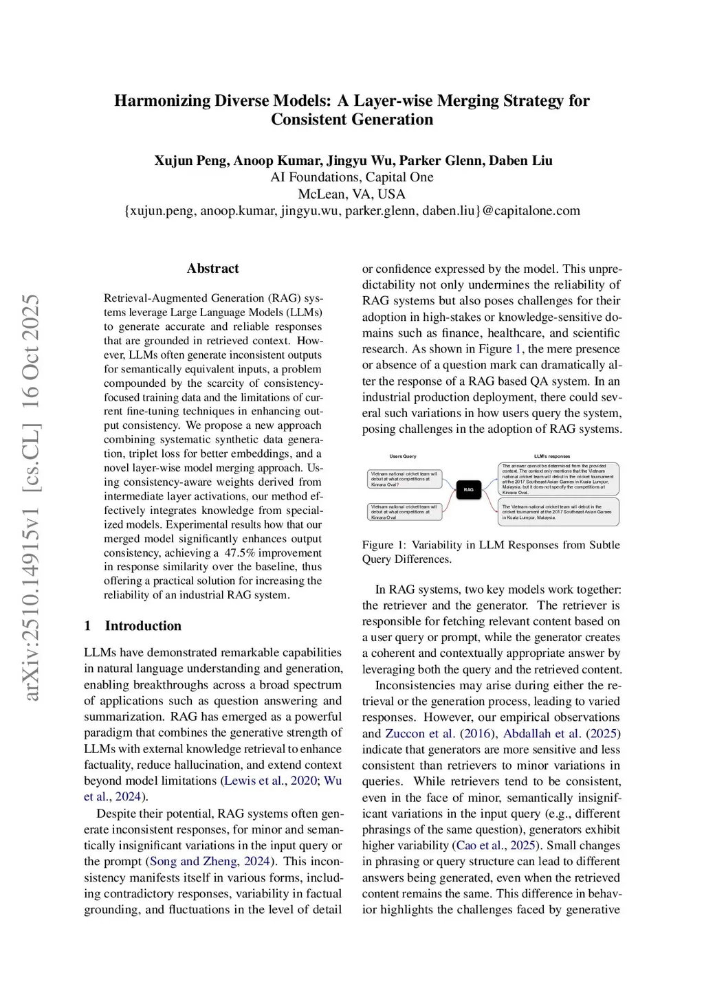 Retrieval-Augmented Generation (RAG) systems leverage Large Language Models (LLMs) to generate accurate and reliable responses that are grounded in retrieved context. However, LLMs often generate inconsistent outputs for semantically equivalent inputs, a problem compounded by the scarcity of consistency-focused training data and the limitations of current fine-tuning techniques in enhancing output consistency. We propose a new approach combining systematic synthetic data generation, triplet loss for better embeddings, and a novel layer-wise model merging approach. Using consistency-aware weights derived from intermediate layer activations, our method effectively integrates knowledge from specialized models. Experimental results how that our merged model significantly enhances output consistency, achieving a ~47.5\% improvement in response similarity over the baseline, thus offering a practical solution for increasing the reliability of an industrial RAG system.