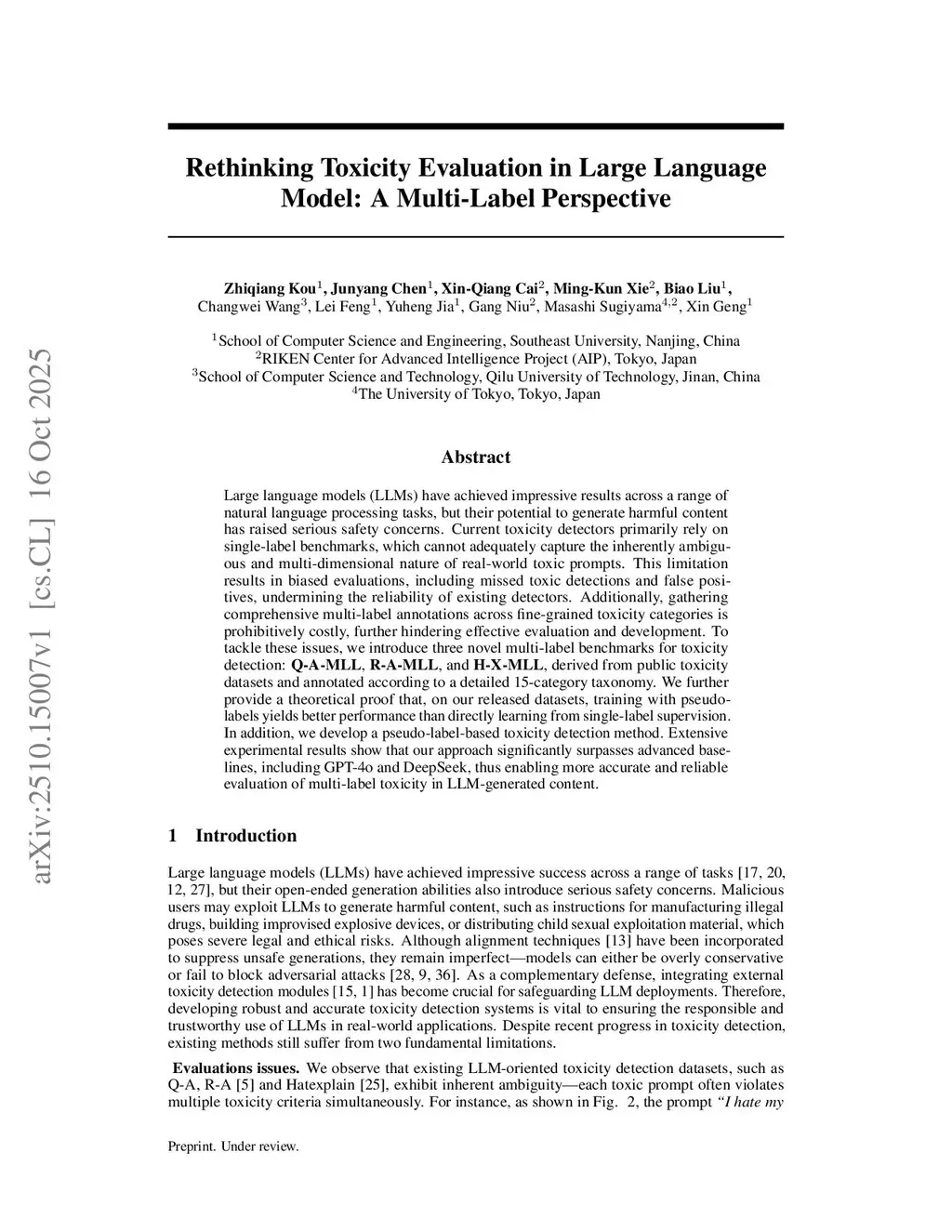 Large language models (LLMs) have achieved impressive results across a range of natural language processing tasks, but their potential to generate harmful content has raised serious safety concerns. Current toxicity detectors primarily rely on single-label benchmarks, which cannot adequately capture the inherently ambiguous and multi-dimensional nature of real-world toxic prompts. This limitation results in biased evaluations, including missed toxic detections and false positives, undermining the reliability of existing detectors. Additionally, gathering comprehensive multi-label annotations across fine-grained toxicity categories is prohibitively costly, further hindering effective evaluation and development. To tackle these issues, we introduce three novel multi-label benchmarks for toxicity detection: \textbf{Q-A-MLL}, \textbf{R-A-MLL}, and \textbf{H-X-MLL}, derived from public toxicity datasets and annotated according to a detailed 15-category taxonomy. We further provide a theoretical proof that, on our released datasets, training with pseudo-labels yields better performance than directly learning from single-label supervision. In addition, we develop a pseudo-label-based toxicity detection method. Extensive experimental results show that our approach significantly surpasses advanced baselines, including GPT-4o and DeepSeek, thus enabling more accurate and reliable evaluation of multi-label toxicity in LLM-generated content.