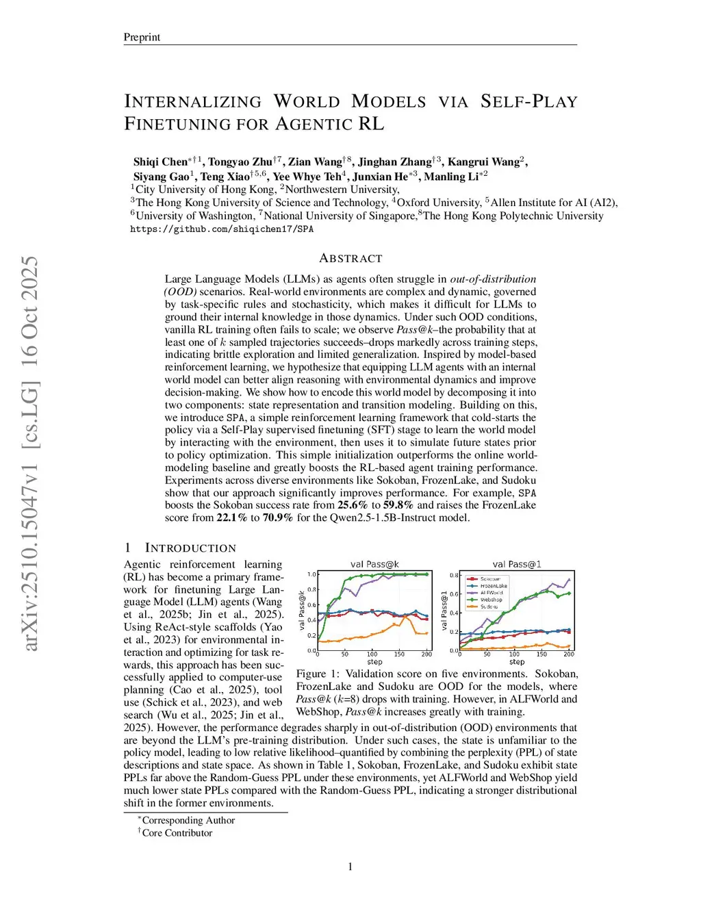 Large Language Models (LLMs) as agents often struggle in out-of-distribution (OOD) scenarios. Real-world environments are complex and dynamic, governed by task-specific rules and stochasticity, which makes it difficult for LLMs to ground their internal knowledge in those dynamics. Under such OOD conditions, vanilla RL training often fails to scale; we observe Pass@k--the probability that at least one of (k) sampled trajectories succeeds--drops markedly across training steps, indicating brittle exploration and limited generalization. Inspired by model-based reinforcement learning, we hypothesize that equipping LLM agents with an internal world model can better align reasoning with environmental dynamics and improve decision-making. We show how to encode this world model by decomposing it into two components: state representation and transition modeling. Building on this, we introduce SPA, a simple reinforcement learning framework that cold-starts the policy via a Self-Play supervised finetuning (SFT) stage to learn the world model by interacting with the environment, then uses it to simulate future states prior to policy optimization. This simple initialization outperforms the online world-modeling baseline and greatly boosts the RL-based agent training performance. Experiments across diverse environments like Sokoban, FrozenLake, and Sudoku show that our approach significantly improves performance. For example, SPA boosts the Sokoban success rate from 25.6% to 59.8% and raises the FrozenLake score from 22.1% to 70.9% for the Qwen2.5-1.5B-Instruct model.