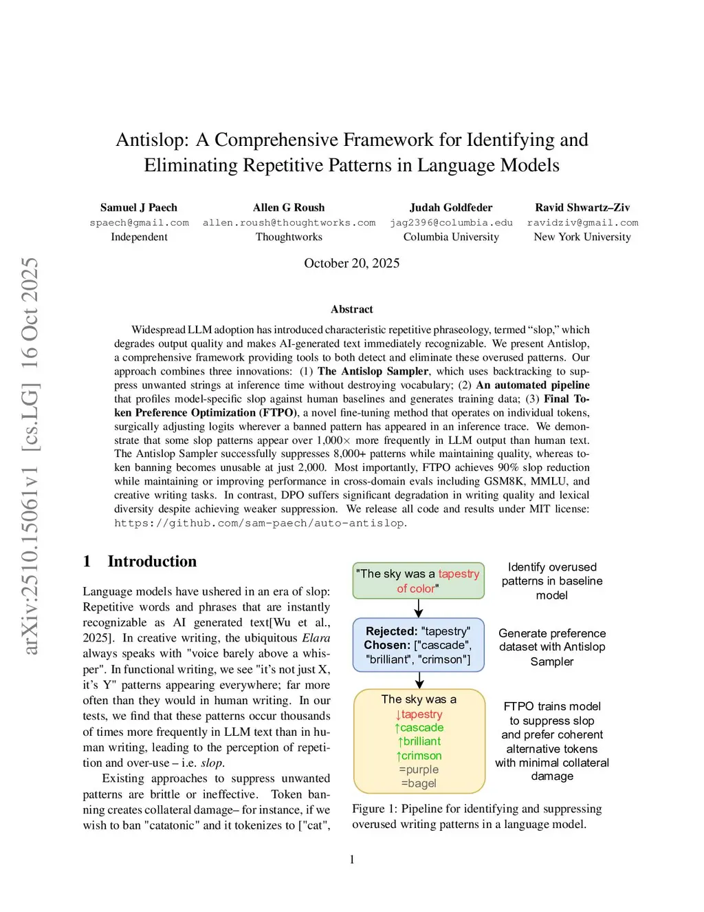 Widespread LLM adoption has introduced characteristic repetitive phraseology, termed "slop," which degrades output quality and makes AI-generated text immediately recognizable. We present Antislop, a comprehensive framework providing tools to both detect and eliminate these overused patterns. Our approach combines three innovations: (1) The Antislop Sampler, which uses backtracking to suppress unwanted strings at inference time without destroying vocabulary; (2) An automated pipeline that profiles model-specific slop against human baselines and generates training data; (3) Final Token Preference Optimization (FTPO), a novel fine-tuning method that operates on individual tokens, surgically adjusting logits wherever a banned pattern has appeared in an inference trace. We demonstrate that some slop patterns appear over 1,000x more frequently in LLM output than human text. The Antislop Sampler successfully suppresses 8,000+ patterns while maintaining quality, whereas token banning becomes unusable at just 2,000. Most importantly, FTPO achieves 90% slop reduction while maintaining or improving performance in cross-domain evals including GSM8K, MMLU, and creative writing tasks. In contrast, DPO suffers significant degradation in writing quality and lexical diversity despite achieving weaker suppression. We release all code and results under MIT license:this https URL.