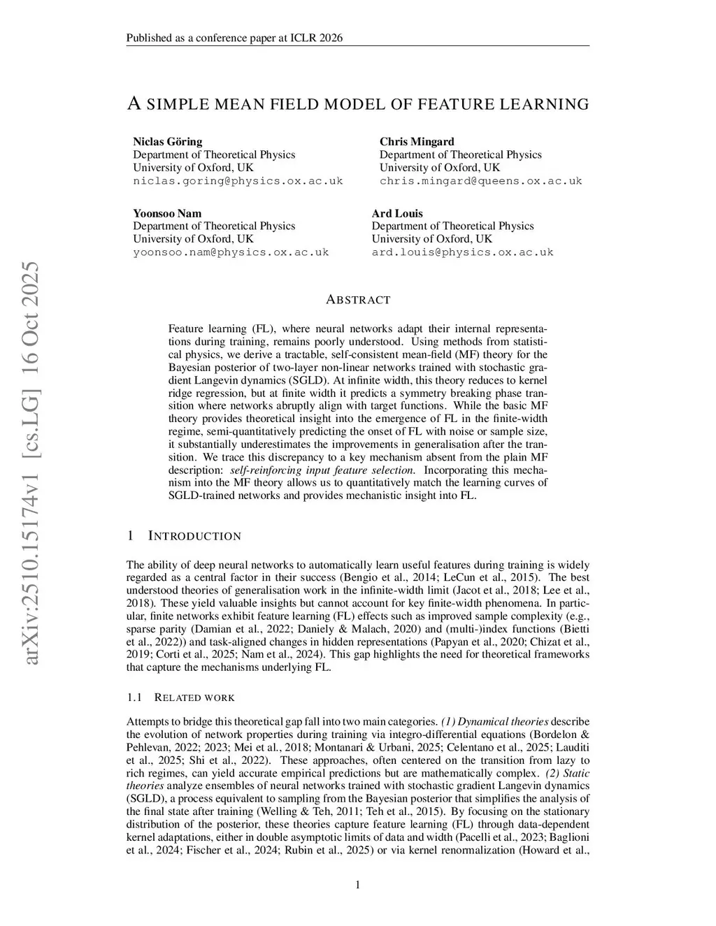 Feature learning (FL), where neural networks adapt their internal representations during training, remains poorly understood. Using methods from statistical physics, we derive a tractable, self-consistent mean-field (MF) theory for the Bayesian posterior of two-layer non-linear networks trained with stochastic gradient Langevin dynamics (SGLD). At infinite width, this theory reduces to kernel ridge regression, but at finite width it predicts a symmetry breaking phase transition where networks abruptly align with target functions. While the basic MF theory provides theoretical insight into the emergence of FL in the finite-width regime, semi-quantitatively predicting the onset of FL with noise or sample size, it substantially underestimates the improvements in generalisation after the transition. We trace this discrepancy to a key mechanism absent from the plain MF description: \textit{self-reinforcing input feature selection}. Incorporating this mechanism into the MF theory allows us to quantitatively match the learning curves of SGLD-trained networks and provides mechanistic insight into FL.