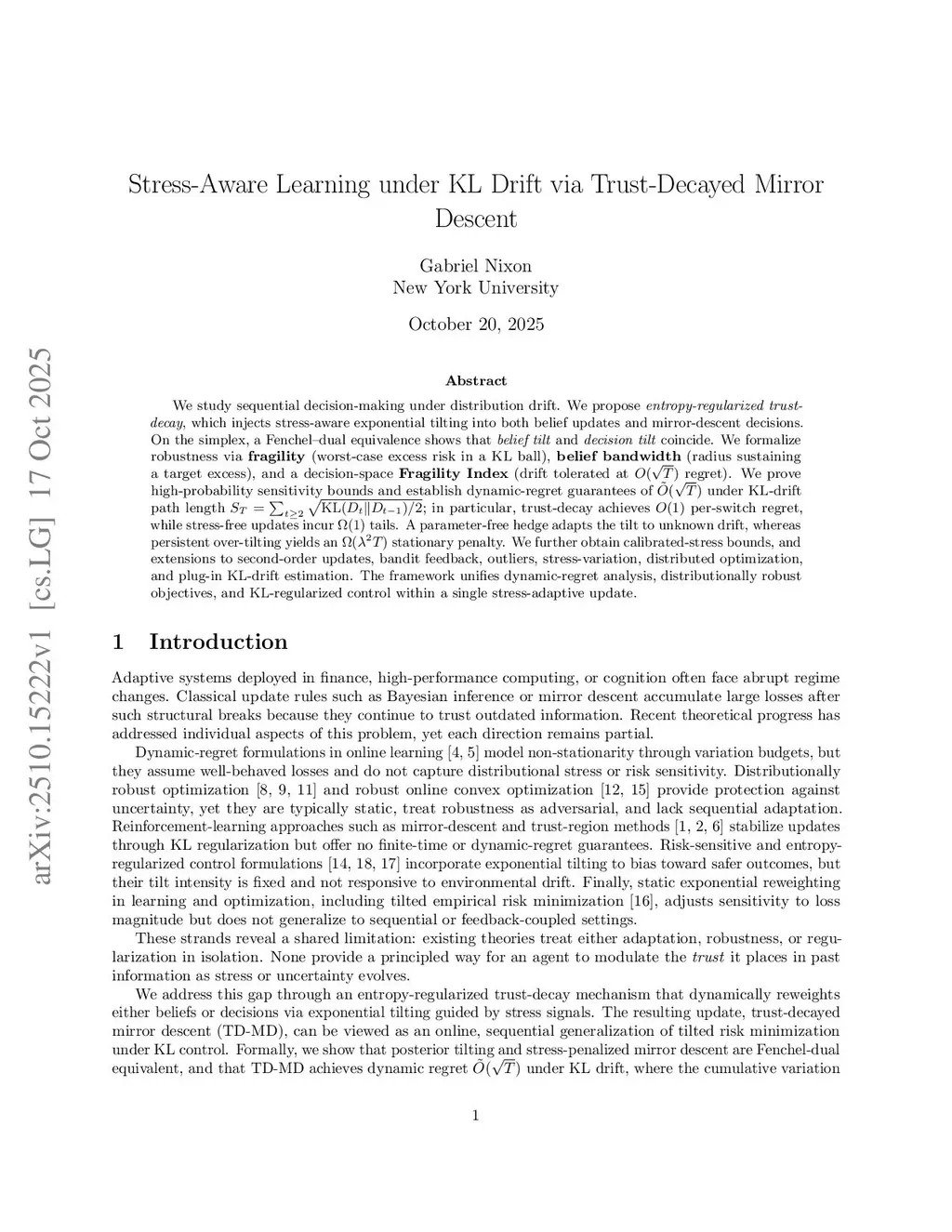 We study sequential decision-making under distribution drift. We propose entropy-regularized trust-decay, which injects stress-aware exponential tilting into both belief updates and mirror-descent decisions. On the simplex, a Fenchel-dual equivalence shows that belief tilt and decision tilt coincide. We formalize robustness via fragility (worst-case excess risk in a KL ball), belief bandwidth (radius sustaining a target excess), and a decision-space Fragility Index (drift tolerated at regret). We prove high-probability sensitivity bounds and establish dynamic-regret guarantees of under KL-drift path length . In particular, trust-decay achieves per-switch regret, while stress-free updates incur tails. A parameter-free hedge adapts the tilt to unknown drift, whereas persistent over-tilting yields an stationary penalty. We further obtain calibrated-stress bounds and extensions to second-order updates, bandit feedback, outliers, stress variation, distributed optimization, and plug-in KL-drift estimation. The framework unifies dynamic-regret analysis, distributionally robust objectives, and KL-regularized control within a single stress-adaptive update.