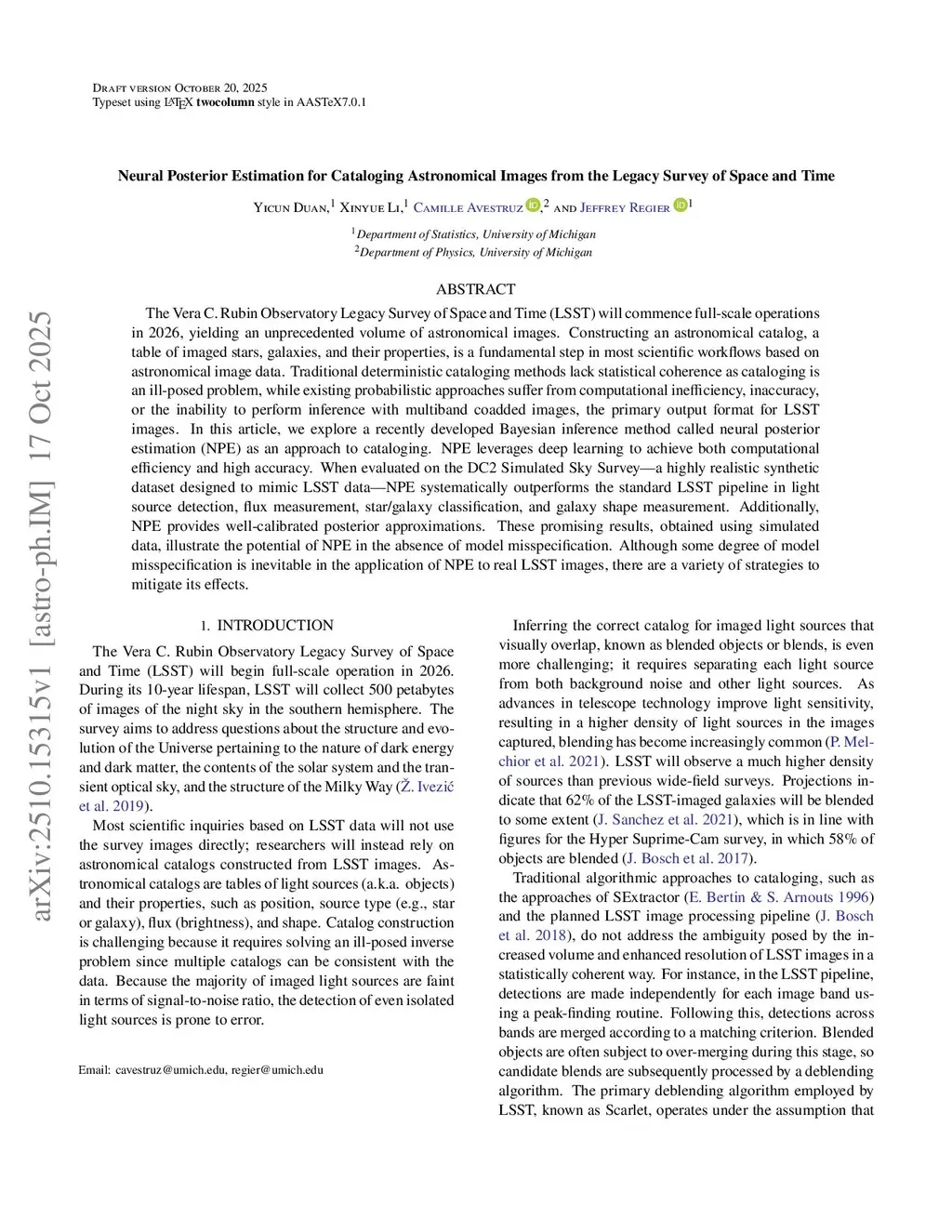 The Vera C. Rubin Observatory Legacy Survey of Space and Time (LSST) will commence full-scale operations in 2026, yielding an unprecedented volume of astronomical images. Constructing an astronomical catalog, a table of imaged stars, galaxies, and their properties, is a fundamental step in most scientific workflows based on astronomical image data. Traditional deterministic cataloging methods lack statistical coherence as cataloging is an ill-posed problem, while existing probabilistic approaches suffer from computational inefficiency, inaccuracy, or the inability to perform inference with multiband coadded images, the primary output format for LSST images. In this article, we explore a recently developed Bayesian inference method called neural posterior estimation (NPE) as an approach to cataloging. NPE leverages deep learning to achieve both computational efficiency and high accuracy. When evaluated on the DC2 Simulated Sky Survey -- a highly realistic synthetic dataset designed to mimic LSST data -- NPE systematically outperforms the standard LSST pipeline in light source detection, flux measurement, star/galaxy classification, and galaxy shape measurement. Additionally, NPE provides well-calibrated posterior approximations. These promising results, obtained using simulated data, illustrate the potential of NPE in the absence of model misspecification. Although some degree of model misspecification is inevitable in the application of NPE to real LSST images, there are a variety of strategies to mitigate its effects.