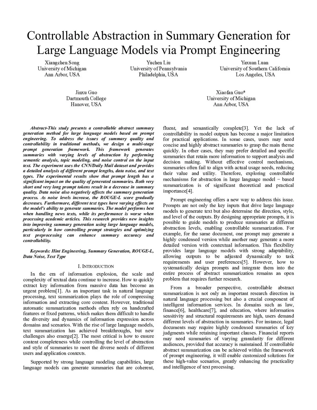 This study presents a controllable abstract summary generation method for large language models based on prompt engineering. To address the issues of summary quality and controllability in traditional methods, we design a multi-stage prompt generation framework. This framework generates summaries with varying levels of abstraction by performing semantic analysis, topic modeling, and noise control on the input text. The experiment uses the CNN/Daily Mail dataset and provides a detailed analysis of different prompt lengths, data noise, and text types. The experimental results show that prompt length has a significant impact on the quality of generated summaries. Both very short and very long prompt tokens result in a decrease in summary quality. Data noise also negatively affects the summary generation process. As noise levels increase, the ROUGE-L score gradually decreases. Furthermore, different text types have varying effects on the model's ability to generate summaries. The model performs best when handling news texts, while its performance is worse when processing academic articles. This research provides new insights into improving summary generation using large language models, particularly in how controlling prompt strategies and optimizing text preprocessing can enhance summary accuracy and controllability.