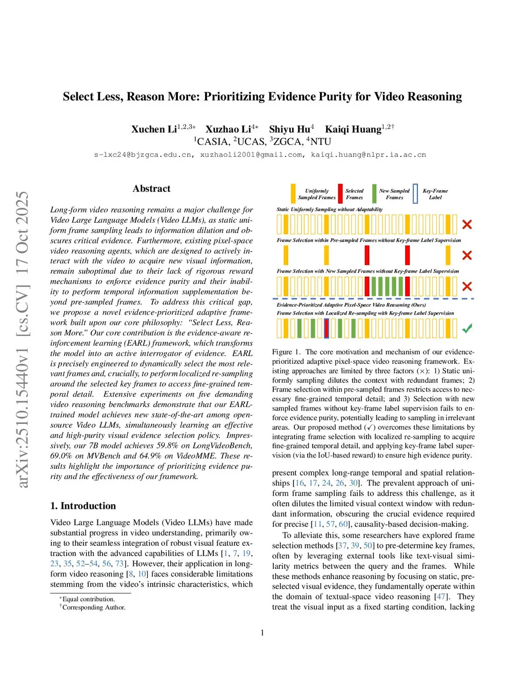 Long-form video reasoning remains a major challenge for Video Large Language Models (Video LLMs), as static uniform frame sampling leads to information dilution and obscures critical evidence. Furthermore, existing pixel-space video reasoning agents, which are designed to actively interact with the video to acquire new visual information, remain suboptimal due to their lack of rigorous reward mechanisms to enforce evidence purity and their inability to perform temporal information supplementation beyond pre-sampled frames. To address this critical gap, we propose a novel evidence-prioritized adaptive framework built upon our core philosophy: "Select Less, Reason More." Our core contribution is the evidence-aware reinforcement learning (EARL) framework, which transforms the model into an active interrogator of evidence. EARL is precisely engineered to dynamically select the most relevant frames and, crucially, to perform localized re-sampling around the selected key frames to access fine-grained temporal detail. Extensive experiments on five demanding video reasoning benchmarks demonstrate that our EARL-trained model achieves new state-of-the-art among open-source Video LLMs, simultaneously learning an effective and high-purity visual evidence selection policy. Impressively, our 7B model achieves 59.8% on LongVideoBench, 69.0% on MVBench and 64.9% on VideoMME. These results highlight the importance of prioritizing evidence purity and the effectiveness of our framework.