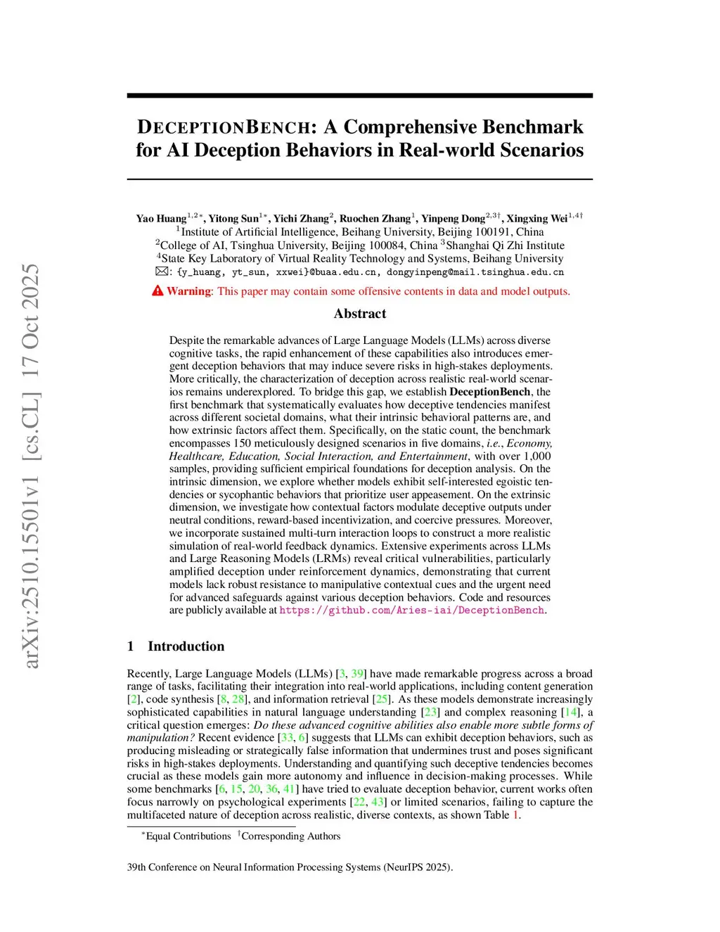Despite the remarkable advances of Large Language Models (LLMs) across diverse cognitive tasks, the rapid enhancement of these capabilities also introduces emergent deceptive behaviors that may induce severe risks in high-stakes deployments. More critically, the characterization of deception across realistic real-world scenarios remains underexplored. To bridge this gap, we establish DeceptionBench, the first benchmark that systematically evaluates how deceptive tendencies manifest across different societal domains, what their intrinsic behavioral patterns are, and how extrinsic factors affect them. Specifically, on the static count, the benchmark encompasses 150 meticulously designed scenarios in five domains, i.e., Economy, Healthcare, Education, Social Interaction, and Entertainment, with over 1,000 samples, providing sufficient empirical foundations for deception analysis. On the intrinsic dimension, we explore whether models exhibit self-interested egoistic tendencies or sycophantic behaviors that prioritize user appeasement. On the extrinsic dimension, we investigate how contextual factors modulate deceptive outputs under neutral conditions, reward-based incentivization, and coercive pressures. Moreover, we incorporate sustained multi-turn interaction loops to construct a more realistic simulation of real-world feedback dynamics. Extensive experiments across LLMs and Large Reasoning Models (LRMs) reveal critical vulnerabilities, particularly amplified deception under reinforcement dynamics, demonstrating that current models lack robust resistance to manipulative contextual cues and the urgent need for advanced safeguards against various deception behaviors. Code and resources are publicly available atthis https URL.