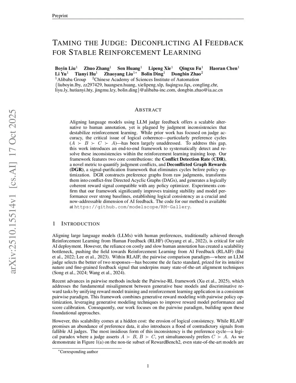 Aligning language models using LLM judge feedback offers a scalable alternative to human annotation, yet is plagued by judgment inconsistencies that destabilize reinforcement learning. While prior work has focused on judge accuracy, the critical issue of logical coherence particularly preference cycles has been largely unaddressed. To address this gap, this work introduces an end to end framework to systematically detect and resolve these inconsistencies within the reinforcement learning training loop. Our framework features two core contributions: the Conflict Detection Rate (CDR), a novel metric to quantify judgment conflicts, and Deconflicted Graph Rewards (DGR), a signal-purification framework that eliminates cycles before policy optimization. DGR constructs preference graphs from raw judgments, transforms them into conflict-free Directed Acyclic Graphs (DAGs), and generates a logically coherent reward signal compatible with any policy optimizer. Experiments confirm that our framework significantly improves training stability and model performance over strong baselines, establishing logical consistency as a crucial and now-addressable dimension of AI feedback. The code for our method is available atthis https URL.