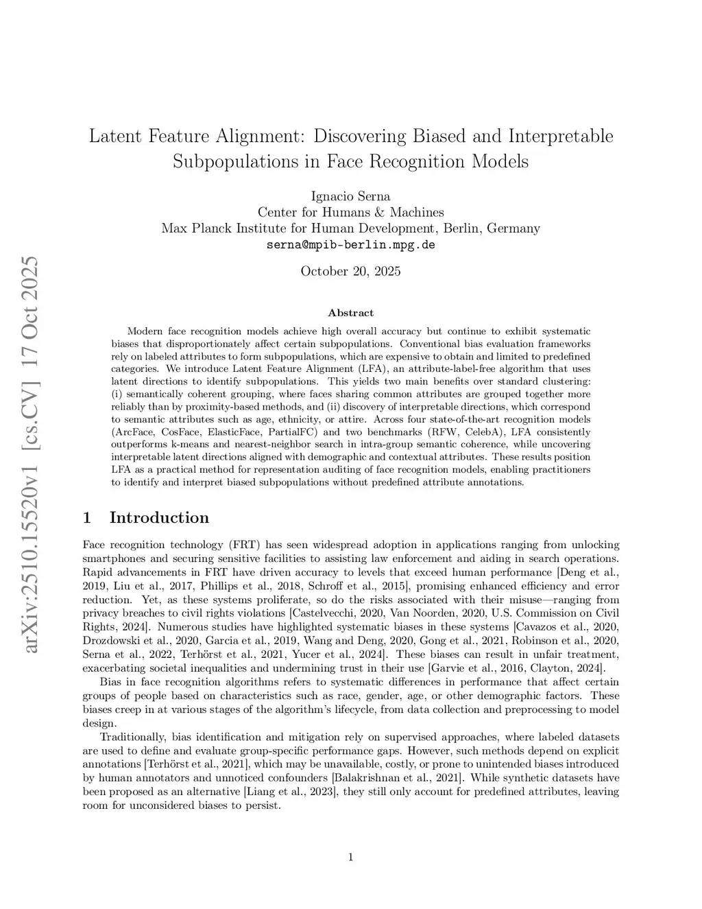 Modern face recognition models achieve high overall accuracy but continue to exhibit systematic biases that disproportionately affect certain subpopulations. Conventional bias evaluation frameworks rely on labeled attributes to form subpopulations, which are expensive to obtain and limited to predefined categories. We introduce Latent Feature Alignment (LFA), an attribute-label-free algorithm that uses latent directions to identify subpopulations. This yields two main benefits over standard clustering: (i) semantically coherent grouping, where faces sharing common attributes are grouped together more reliably than by proximity-based methods, and (ii) discovery of interpretable directions, which correspond to semantic attributes such as age, ethnicity, or attire. Across four state-of-the-art recognition models (ArcFace, CosFace, ElasticFace, PartialFC) and two benchmarks (RFW, CelebA), LFA consistently outperforms k-means and nearest-neighbor search in intra-group semantic coherence, while uncovering interpretable latent directions aligned with demographic and contextual attributes. These results position LFA as a practical method for representation auditing of face recognition models, enabling practitioners to identify and interpret biased subpopulations without predefined attribute annotations.