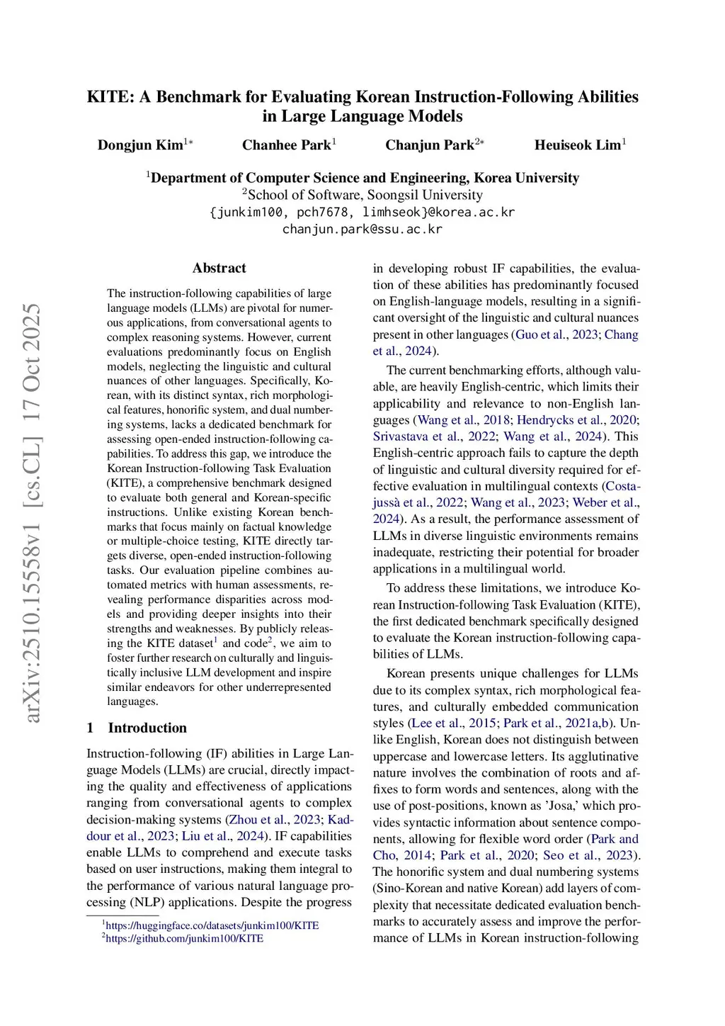 KITE: A Benchmark for Evaluating Korean Instruction-Following Abilities in Large Language Models