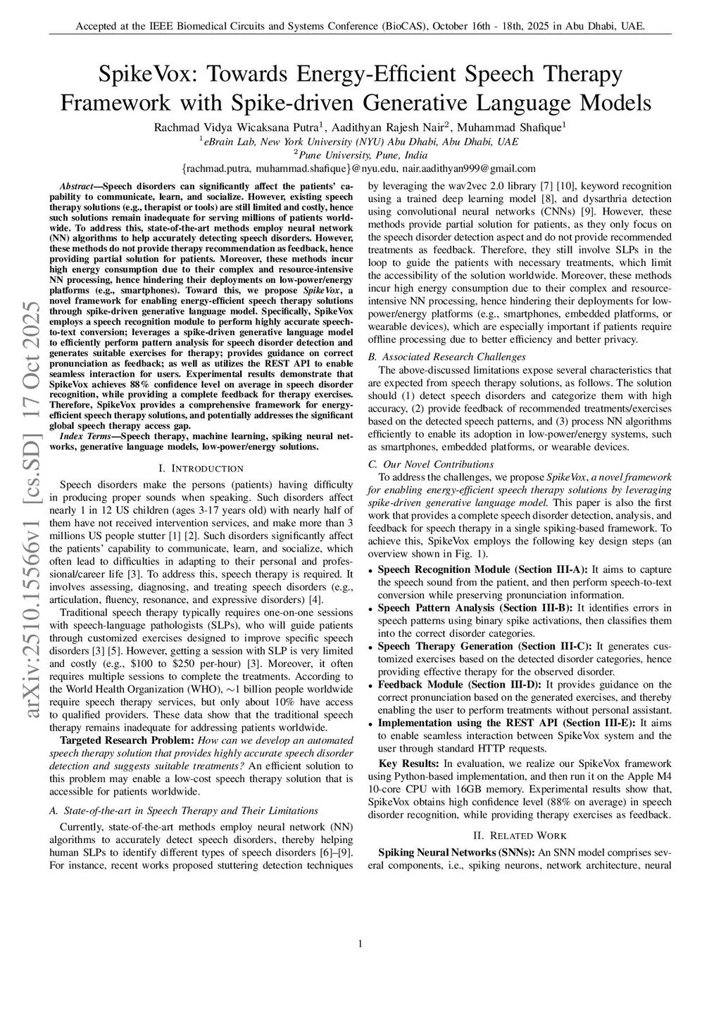Speech disorders can significantly affect the patients capability to communicate, learn, and socialize. However, existing speech therapy solutions (e.g., therapist or tools) are still limited and costly, hence such solutions remain inadequate for serving millions of patients worldwide. To address this, state-of-the-art methods employ neural network (NN) algorithms to help accurately detecting speech disorders. However, these methods do not provide therapy recommendation as feedback, hence providing partial solution for patients. Moreover, these methods incur high energy consumption due to their complex and resource-intensive NN processing, hence hindering their deployments on low-power/energy platforms (e.g., smartphones). Toward this, we propose SpikeVox, a novel framework for enabling energy-efficient speech therapy solutions through spike-driven generative language model. Specifically, SpikeVox employs a speech recognition module to perform highly accurate speech-to-text conversion; leverages a spike-driven generative language model to efficiently perform pattern analysis for speech disorder detection and generates suitable exercises for therapy; provides guidance on correct pronunciation as feedback; as well as utilizes the REST API to enable seamless interaction for users. Experimental results demonstrate that SpikeVox achieves 88% confidence level on average in speech disorder recognition, while providing a complete feedback for therapy exercises. Therefore, SpikeVox provides a comprehensive framework for energy-efficient speech therapy solutions, and potentially addresses the significant global speech therapy access gap.