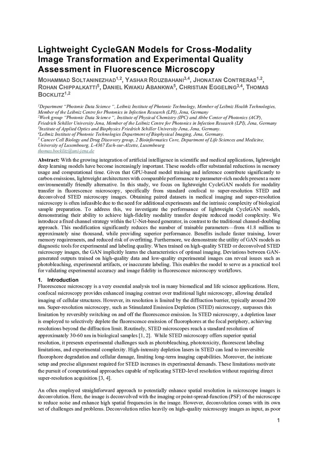 Lightweight CycleGAN Models for Cross-Modality Image Transformation and Experimental Quality Assessment in Fluorescence Microscopy