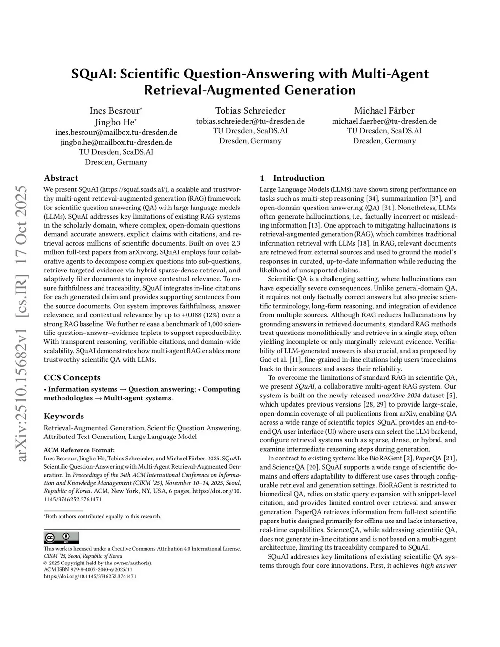 SQuAI: Scientific Question-Answering with Multi-Agent Retrieval-Augmented Generation