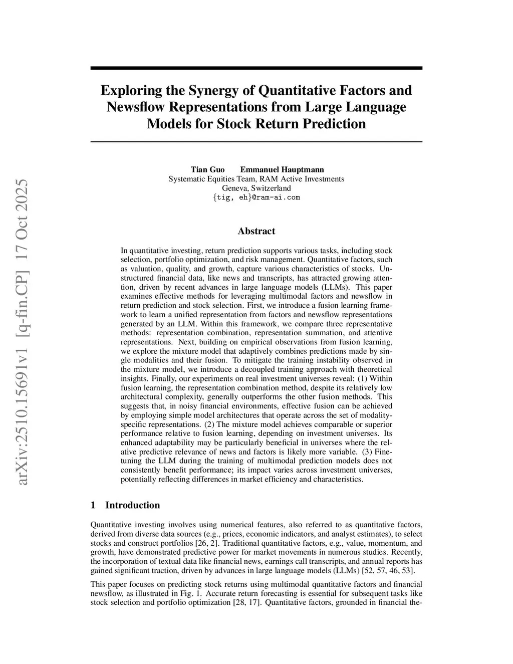 In quantitative investing, return prediction supports various tasks, including stock selection, portfolio optimization, and risk management. Quantitative factors, such as valuation, quality, and growth, capture various characteristics of stocks. Unstructured data, like news and transcripts, has attracted growing attention, driven by recent advances in large language models (LLMs). This paper examines effective methods for leveraging multimodal factors and newsflow in return prediction and stock selection. First, we introduce a fusion learning framework to learn a unified representation from factors and newsflow representations generated by an LLM. Within this framework, we compare three methods of different architectural complexities: representation combination, representation summation, and attentive representations. Next, building on the limitation of fusion learning observed in empirical comparison, we explore the mixture model that adaptively combines predictions made by single modalities and their fusion. To mitigate the training instability of the mixture model, we introduce a decoupled training approach with theoretical insights. Finally, our experiments on real investment universes yield several insights into effective multimodal modeling of factors and news for stock return prediction and selection.