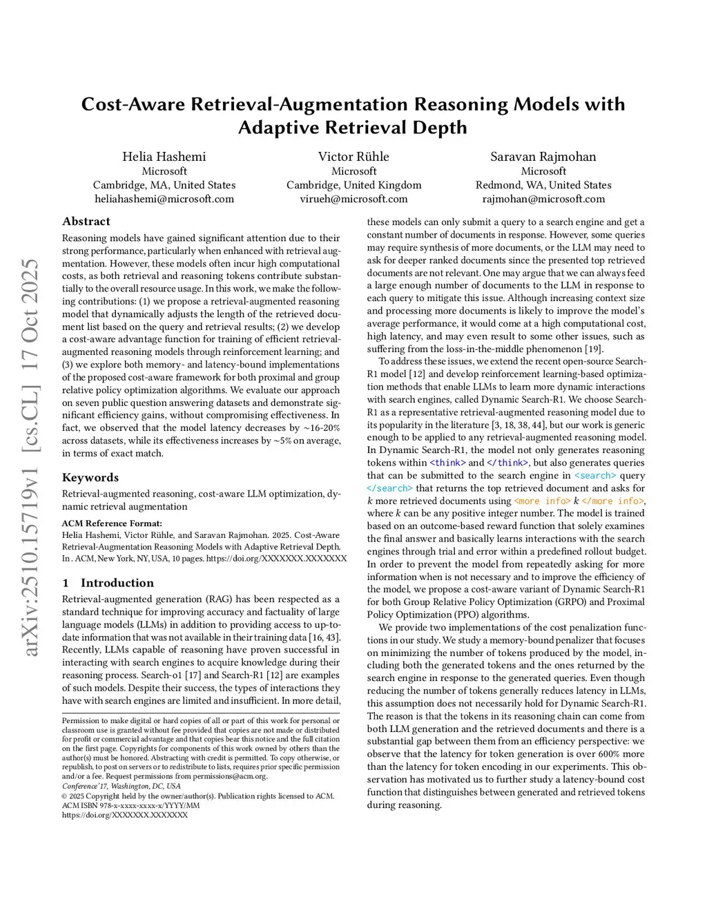 Reasoning models have gained significant attention due to their strong performance, particularly when enhanced with retrieval augmentation. However, these models often incur high computational costs, as both retrieval and reasoning tokens contribute substantially to the overall resource usage. In this work, we make the following contributions: (1) we propose a retrieval-augmented reasoning model that dynamically adjusts the length of the retrieved document list based on the query and retrieval results; (2) we develop a cost-aware advantage function for training of efficient retrieval-augmented reasoning models through reinforcement learning; and (3) we explore both memory- and latency-bound implementations of the proposed cost-aware framework for both proximal and group relative policy optimization algorithms. We evaluate our approach on seven public question answering datasets and demonstrate significant efficiency gains, without compromising effectiveness. In fact, we observed that the model latency decreases by ~16-20% across datasets, while its effectiveness increases by ~5% on average, in terms of exact match.