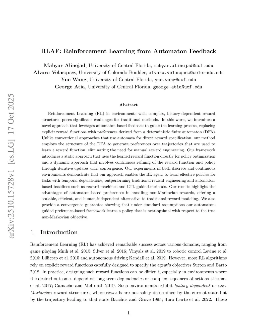 Reinforcement Learning (RL) in environments with complex, history-dependent reward structures poses significant challenges for traditional methods. In this work, we introduce a novel approach that leverages automaton-based feedback to guide the learning process, replacing explicit reward functions with preferences derived from a deterministic finite automaton (DFA). Unlike conventional approaches that use automata for direct reward specification, our method employs the structure of the DFA to generate preferences over trajectories that are used to learn a reward function, eliminating the need for manual reward engineering. Our framework introduces a static approach that uses the learned reward function directly for policy optimization and a dynamic approach that involves continuous refining of the reward function and policy through iterative updates until convergence.Our experiments in both discrete and continuous environments demonstrate that our approach enables the RL agent to learn effective policies for tasks with temporal dependencies, outperforming traditional reward engineering and automaton-based baselines such as reward machines and LTL-guided methods. Our results highlight the advantages of automaton-based preferences in handling non-Markovian rewards, offering a scalable, efficient, and human-independent alternative to traditional reward modeling. We also provide a convergence guarantee showing that under standard assumptions our automaton-guided preference-based framework learns a policy that is near-optimal with respect to the true non-Markovian objective.