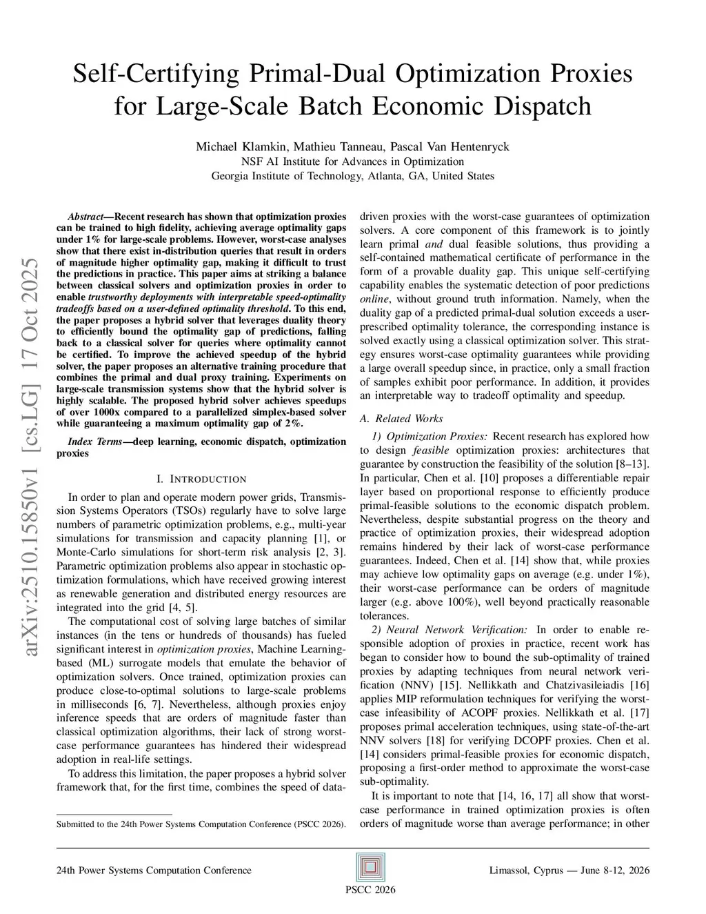 Recent research has shown that optimization proxies can be trained to high fidelity, achieving average optimality gaps under 1% for large-scale problems. However, worst-case analyses show that there exist in-distribution queries that result in orders of magnitude higher optimality gap, making it difficult to trust the predictions in practice. This paper aims at striking a balance between classical solvers and optimization proxies in order to enable trustworthy deployments with interpretable speed-optimality tradeoffs based on a user-defined optimality threshold. To this end, the paper proposes a hybrid solver that leverages duality theory to efficiently bound the optimality gap of predictions, falling back to a classical solver for queries where optimality cannot be certified. To improve the achieved speedup of the hybrid solver, the paper proposes an alternative training procedure that combines the primal and dual proxy training. Experiments on large-scale transmission systems show that the hybrid solver is highly scalable. The proposed hybrid solver achieves speedups of over 1000x compared to a parallelized simplex-based solver while guaranteeing a maximum optimality gap of 2%.