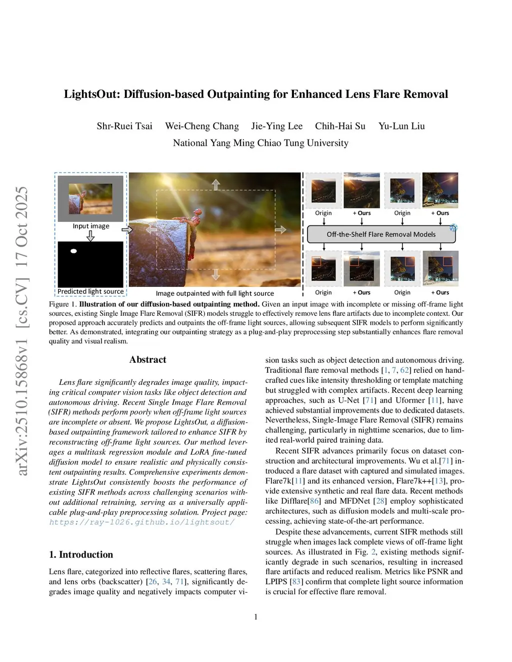 Lens flare significantly degrades image quality, impacting critical computer vision tasks like object detection and autonomous driving. Recent Single Image Flare Removal (SIFR) methods perform poorly when off-frame light sources are incomplete or absent. We propose LightsOut, a diffusion-based outpainting framework tailored to enhance SIFR by reconstructing off-frame light sources. Our method leverages a multitask regression module and LoRA fine-tuned diffusion model to ensure realistic and physically consistent outpainting results. Comprehensive experiments demonstrate LightsOut consistently boosts the performance of existing SIFR methods across challenging scenarios without additional retraining, serving as a universally applicable plug-and-play preprocessing solution. Project page:this https URL