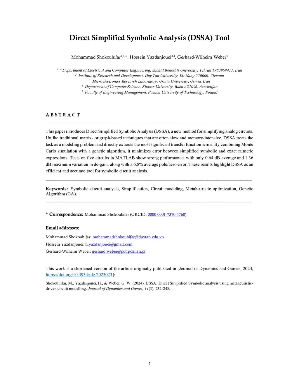 Direct Simplified Symbolic Analysis (DSSA) Tool