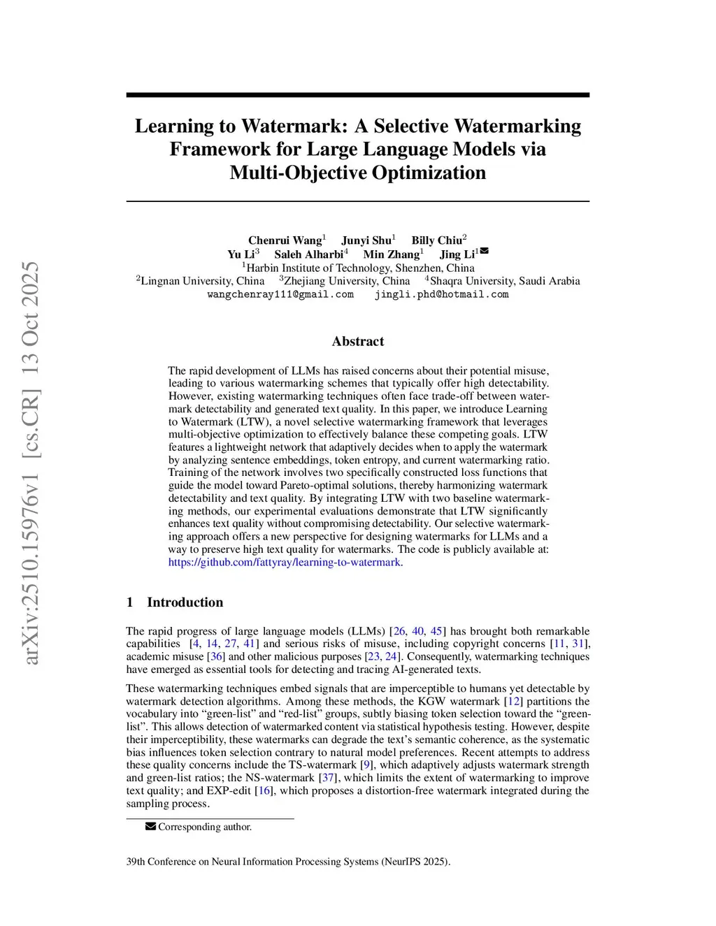 The rapid development of LLMs has raised concerns about their potential misuse, leading to various watermarking schemes that typically offer high detectability. However, existing watermarking techniques often face trade-off between watermark detectability and generated text quality. In this paper, we introduce Learning to Watermark (LTW), a novel selective watermarking framework that leverages multi-objective optimization to effectively balance these competing goals. LTW features a lightweight network that adaptively decides when to apply the watermark by analyzing sentence embeddings, token entropy, and current watermarking ratio. Training of the network involves two specifically constructed loss functions that guide the model toward Pareto-optimal solutions, thereby harmonizing watermark detectability and text quality. By integrating LTW with two baseline watermarking methods, our experimental evaluations demonstrate that LTW significantly enhances text quality without compromising detectability. Our selective watermarking approach offers a new perspective for designing watermarks for LLMs and a way to preserve high text quality for watermarks. The code is publicly available at:this https URL