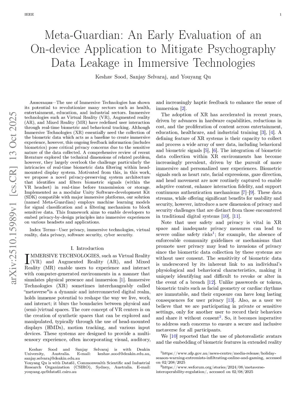 The use of Immersive Technologies has shown its potential to revolutionize many sectors such as health, entertainment, education, and industrial sectors. Immersive technologies such as Virtual Reality (VR), Augmented reality (AR), and Mixed Reality (MR) have redefined user interaction through real-time biometric and behavioral tracking. Although Immersive Technologies (XR) essentially need the collection of the biometric data which acts as a baseline to create immersive experience, however, this ongoing feedback information (includes biometrics) poses critical privacy concerns due to the sensitive nature of the data collected. A comprehensive review of recent literature explored the technical dimensions of related problem; however, they largely overlook the challenge particularly the intricacies of real-time biometric data filtering within head-mounted display system. Motivated from this, in this work, we propose a novel privacy-preserving system architecture that identifies and filters biometric signals (within the VR headset) in real-time before transmission or storage. Implemented as a modular Unity Software-development Kit (SDK) compatible with major immersive platforms, our solution (named Meta-Guardian) employs machine learning models for signal classification and a filtering mechanism to block sensitive data. This framework aims to enable developers to embed privacy-by-design principles into immersive experiences on various headsets and applications.
