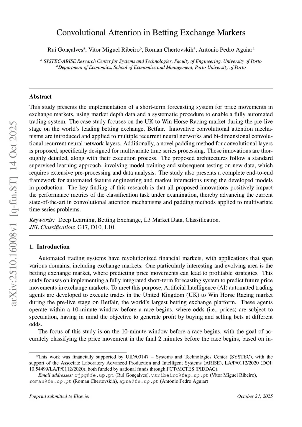 This study presents the implementation of a short-term forecasting system for price movements in exchange markets, using market depth data and a systematic procedure to enable a fully automated trading system. The case study focuses on the UK to Win Horse Racing market during the pre-live stage on the world's leading betting exchange, Betfair. Innovative convolutional attention mechanisms are introduced and applied to multiple recurrent neural networks and bi-dimensional convolutional recurrent neural network layers. Additionally, a novel padding method for convolutional layers is proposed, specifically designed for multivariate time series processing. These innovations are thoroughly detailed, along with their execution process. The proposed architectures follow a standard supervised learning approach, involving model training and subsequent testing on new data, which requires extensive pre-processing and data analysis. The study also presents a complete end-to-end framework for automated feature engineering and market interactions using the developed models in production. The key finding of this research is that all proposed innovations positively impact the performance metrics of the classification task under examination, thereby advancing the current state-of-the-art in convolutional attention mechanisms and padding methods applied to multivariate time series problems.