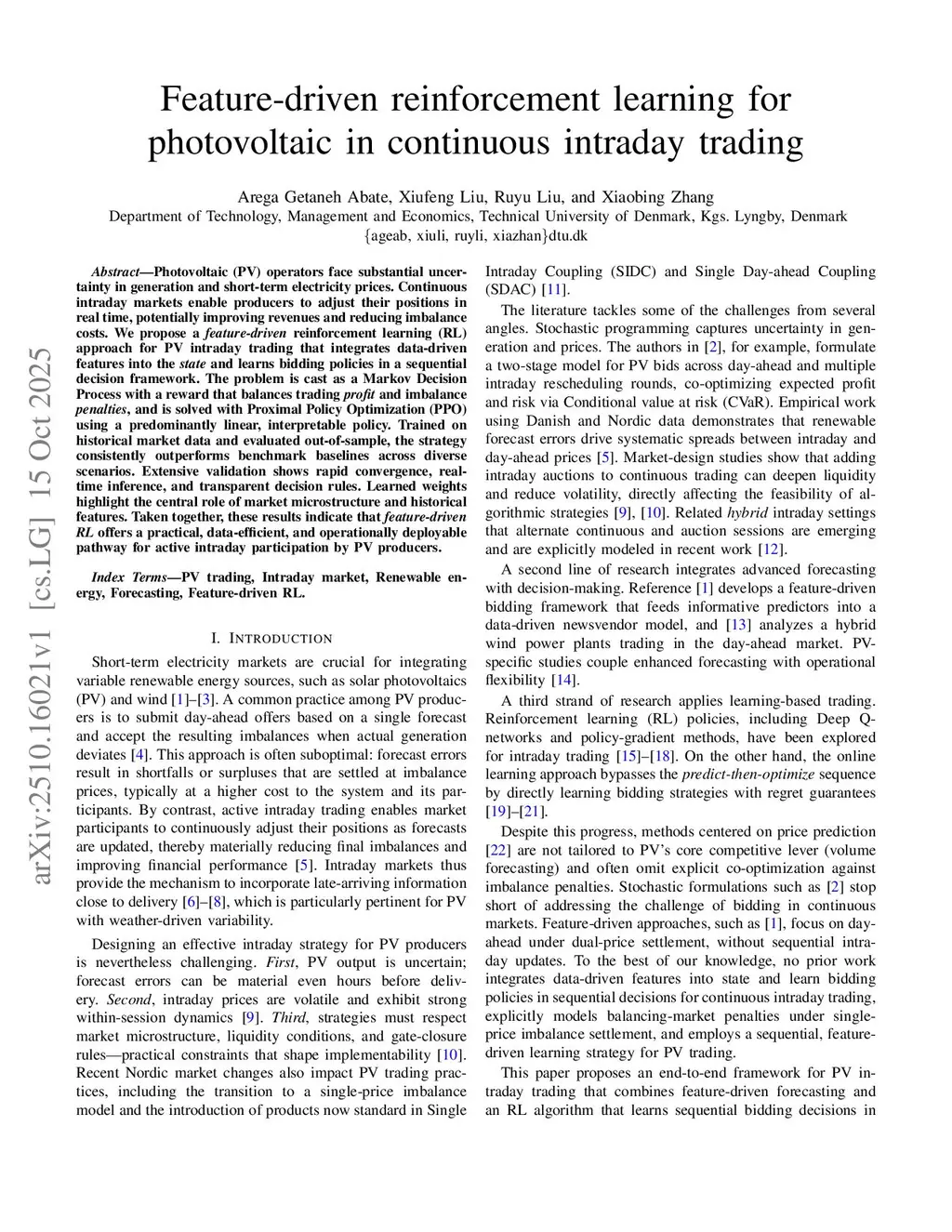Feature-driven reinforcement learning for photovoltaic in continuous intraday trading