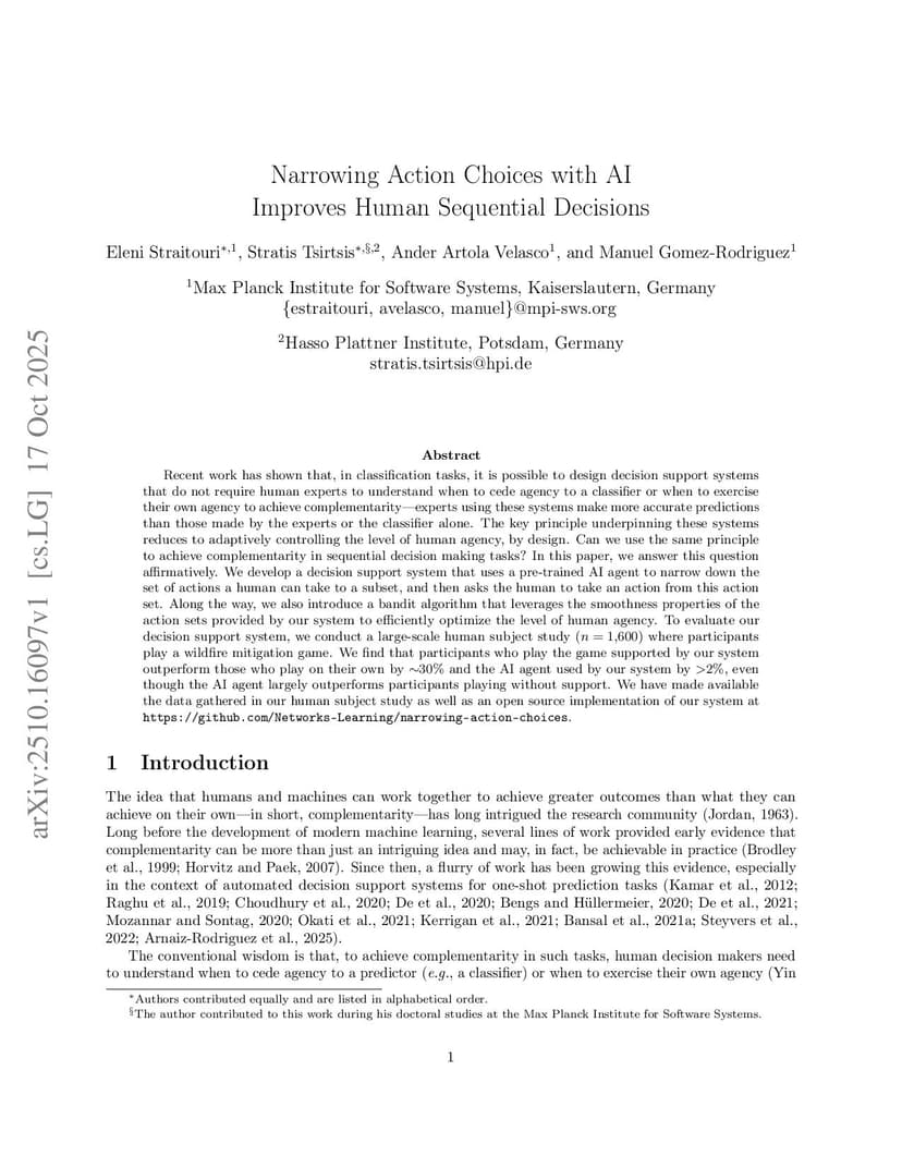 Recent work has shown that, in classification tasks, it is possible to design decision support systems that do not require human experts to understand when to cede agency to a classifier or when to exercise their own agency to achieve complementarityexperts using these systems make more accurate predictions than those made by the experts or the classifier alone. The key principle underpinning these systems reduces to adaptively controlling the level of human agency, by design. Can we use the same principle to achieve complementarity in sequential decision making tasks? In this paper, we answer this question affirmatively. We develop a decision support system that uses a pre-trained AI agent to narrow down the set of actions a human can take to a subset, and then asks the human to take an action from this action set. Along the way, we also introduce a bandit algorithm that leverages the smoothness properties of the action sets provided by our system to efficiently optimize the level of human agency. To evaluate our decision support system, we conduct a large-scale human subject study () where participants play a wildfire mitigation game. We find that participants who play the game supported by our system outperform those who play on their own by % and the AI agent used by our system by %, even though the AI agent largely outperforms participants playing without support. We have made available the data gathered in our human subject study as well as an open source implementation of our system atthis https URL.