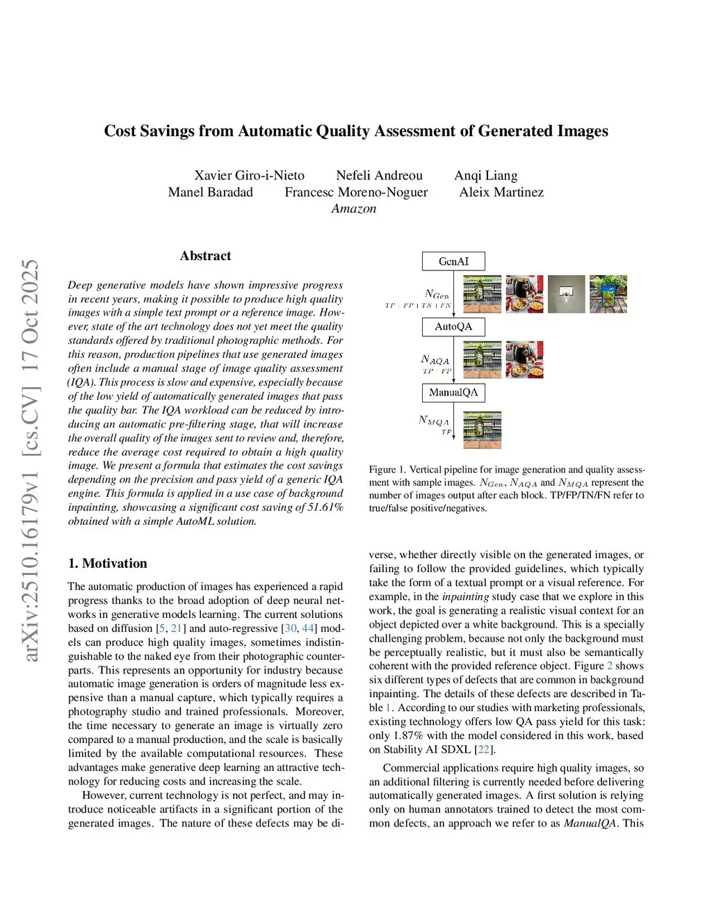Deep generative models have shown impressive progress in recent years, making it possible to produce high quality images with a simple text prompt or a reference image. However, state of the art technology does not yet meet the quality standards offered by traditional photographic methods. For this reason, production pipelines that use generated images often include a manual stage of image quality assessment (IQA). This process is slow and expensive, especially because of the low yield of automatically generated images that pass the quality bar. The IQA workload can be reduced by introducing an automatic pre-filtering stage, that will increase the overall quality of the images sent to review and, therefore, reduce the average cost required to obtain a high quality image. We present a formula that estimates the cost savings depending on the precision and pass yield of a generic IQA engine. This formula is applied in a use case of background inpainting, showcasing a significant cost saving of 51.61% obtained with a simple AutoML solution.