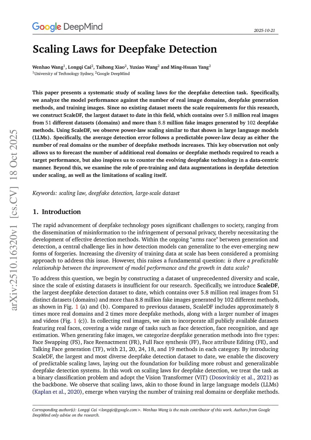 This paper presents a systematic study of scaling laws for the deepfake detection task. Specifically, we analyze the model performance against the number of real image domains, deepfake generation methods, and training images. Since no existing dataset meets the scale requirements for this research, we construct ScaleDF, the largest dataset to date in this field, which contains over 5.8 million real images from 51 different datasets (domains) and more than 8.8 million fake images generated by 102 deepfake methods. Using ScaleDF, we observe power-law scaling similar to that shown in large language models (LLMs). Specifically, the average detection error follows a predictable power-law decay as either the number of real domains or the number of deepfake methods increases. This key observation not only allows us to forecast the number of additional real domains or deepfake methods required to reach a target performance, but also inspires us to counter the evolving deepfake technology in a data-centric manner. Beyond this, we examine the role of pre-training and data augmentations in deepfake detection under scaling, as well as the limitations of scaling itself.
