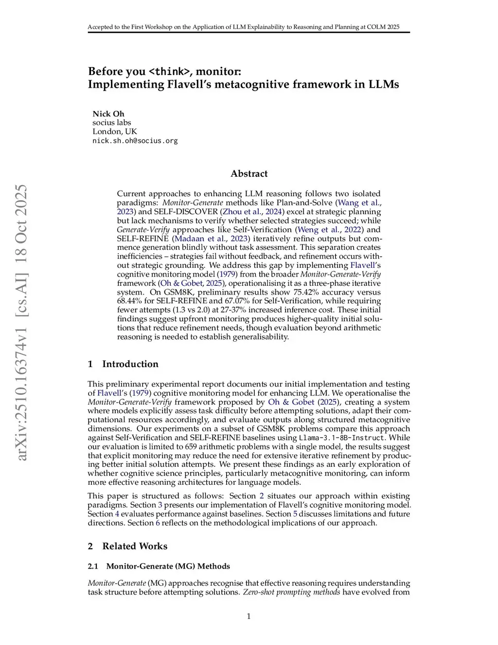 Current approaches to enhancing LLM reasoning follows two isolated paradigms: Monitor-Generate methods like Plan-and-Solve (Wang et al., 2023) and SELF-DISCOVER (Zhou et al., 2024) excel at strategic planning but lack mechanisms to verify whether selected strategies succeed; while Generate-Verify approaches like Self-Verification (Weng et al., 2022) and SELF-REFINE (Madaan et al., 2023) iteratively refine outputs but commence generation blindly without task assessment. This separation creates inefficiencies -- strategies fail without feedback, and refinement occurs without strategic grounding. We address this gap by implementing Flavell's cognitive monitoring model (1979) from the broader Monitor-Generate-Verify framework (Oh and Gobet, 2025), operationalising it as a three-phase iterative system. On GSM8K, preliminary results show 75.42% accuracy versus 68.44% for SELF-REFINE and 67.07% for Self-Verification, while requiring fewer attempts (1.3 vs 2.0) at 27-37% increased inference cost. These initial findings suggest upfront monitoring produces higher-quality initial solutions that reduce refinement needs, though evaluation beyond arithmetic reasoning is needed to establish generalisability.