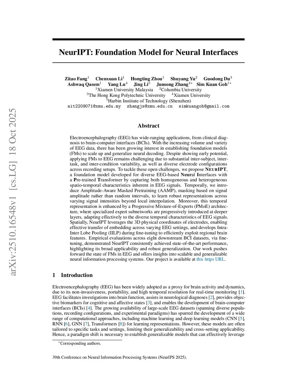 Electroencephalography (EEG) has wide-ranging applications, from clinical diagnosis to brain-computer interfaces (BCIs). With the increasing volume and variety of EEG data, there has been growing interest in establishing foundation models (FMs) to scale up and generalize neural decoding. Despite showing early potential, applying FMs to EEG remains challenging due to substantial inter-subject, inter-task, and inter-condition variability, as well as diverse electrode configurations across recording setups. To tackle these open challenges, we propose NeurIPT, a foundation model developed for diverse EEG-based Neural Interfaces with a Pre-trained Transformer by capturing both homogeneous and heterogeneous spatio-temporal characteristics inherent in EEG signals. Temporally, we introduce Amplitude-Aware Masked Pretraining (AAMP), masking based on signal amplitude rather than random intervals, to learn robust representations across varying signal intensities beyond local interpolation. Moreover, this temporal representation is enhanced by a Progressive Mixture-of-Experts (PMoE) architecture, where specialized expert subnetworks are progressively introduced at deeper layers, adapting effectively to the diverse temporal characteristics of EEG signals. Spatially, NeurIPT leverages the 3D physical coordinates of electrodes, enabling effective transfer of embedding across varying EEG settings, and develops Intra-Inter Lobe Pooling (IILP) during fine-tuning to efficiently exploit regional brain features. Empirical evaluations across eight downstream BCI datasets, via fine-tuning, demonstrated NeurIPT consistently achieved state-of-the-art performance, highlighting its broad applicability and robust generalization. Our work pushes forward the state of FMs in EEG and offers insights into scalable and generalizable neural information processing systems.