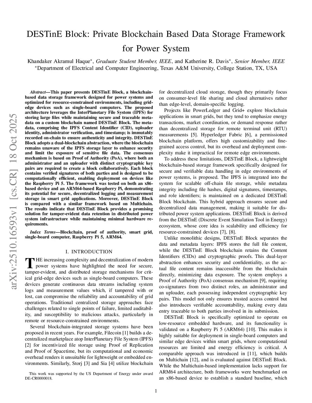 This paper presents DESTinE Block, a blockchain-based data storage framework designed for power systems and optimized for resource-constrained environments, including grid-edge devices such as single-board computers. The proposed architecture leverages the InterPlanetary File System (IPFS) for storing large files while maintaining secure and traceable metadata on a custom blockchain named DESTinE Block. The metadata, comprising the IPFS Content Identifier (CID), uploader identity, administrator verification, and timestamp; is immutably recorded on-chain to ensure authenticity and integrity. DESTinE Block adopts a dual-blockchain abstraction, where the blockchain remains unaware of the IPFS storage layer to enhance security and limit the exposure of sensitive file data. The consensus mechanism is based on Proof of Authority (PoA), where both an administrator and an uploader with distinct cryptographic key pairs are required to create a block collaboratively. Each block contains verified signatures of both parties and is designed to be computationally efficient, enabling deployment on devices like the Raspberry Pi 5. The framework was tested on both an x86-based device and an ARM64-based Raspberry Pi, demonstrating its potential for secure, decentralized logging and measurement storage in smart grid applications. Moreover, DESTinE Block is compared with a similar framework based on Multichain. The results indicate that DESTinE Block provides a promising solution for tamper-evident data retention in distributed power system infrastructure while maintaining minimal hardware requirements.