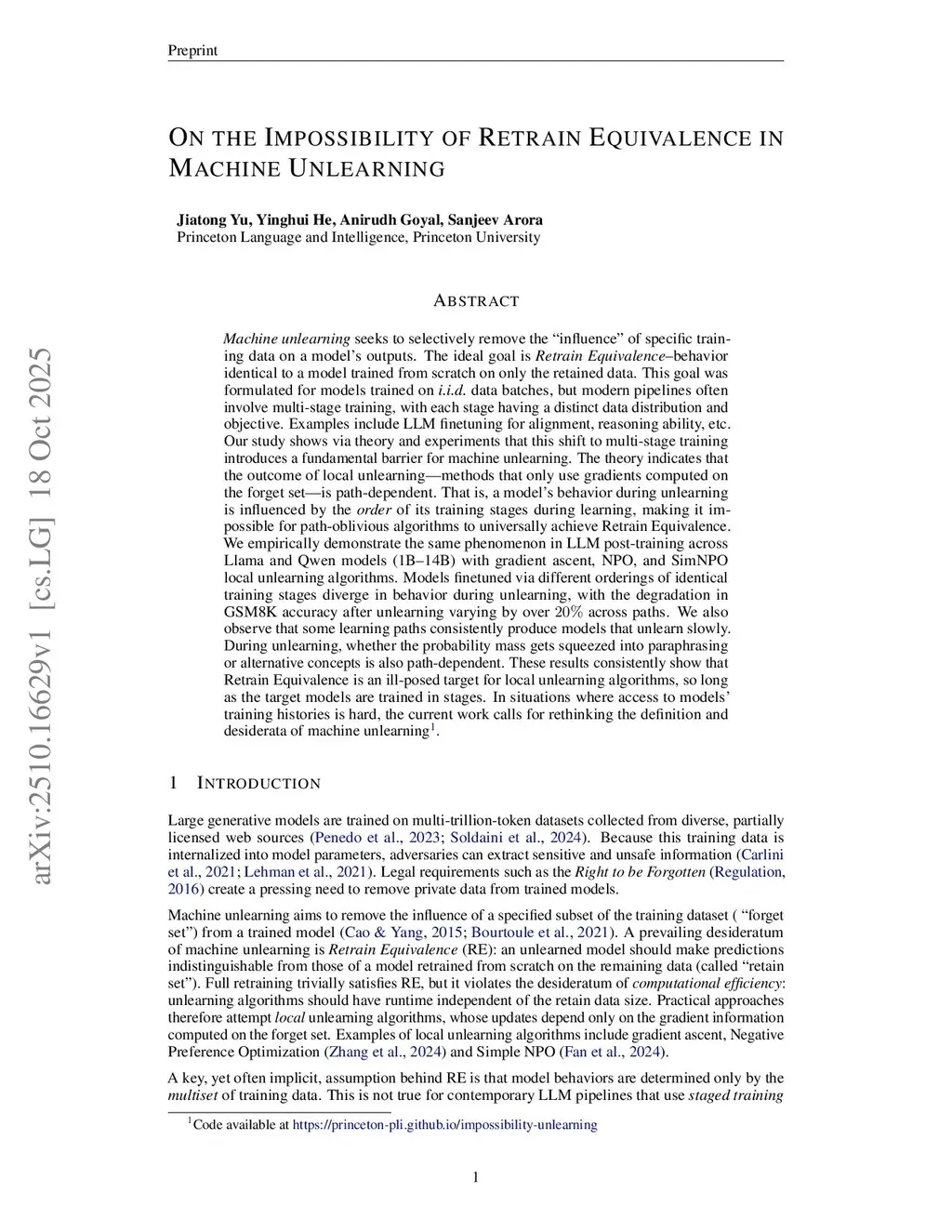 Machine unlearning seeks to selectively remove the "influence" of specific training data on a model's outputs. The ideal goal is Retrain Equivalence--behavior identical to a model trained from scratch on only the retained data. This goal was formulated for models trained on i.i.d. data batches, but modern pipelines often involve multi-stage training, with each stage having a distinct data distribution and objective. Examples include LLM fine-tuning for alignment, reasoning ability, etc. Our study shows via theory and experiments that this shift to multi-stage training introduces a fundamental barrier for machine unlearning. The theory indicates that the outcome of local unlearning--methods that only use gradients computed on the forget set--is path-dependent. That is, a model's behavior during unlearning is influenced by the order of its training stages during learning, making it impossible for path-oblivious algorithms to universally achieve Retrain Equivalence. We empirically demonstrate the same phenomenon in LLM post-training across Llama and Qwen models (1B to 14B) with gradient ascent, NPO, and SimNPO local unlearning algorithms. Models fine-tuned via different orderings of identical training stages diverge in behavior during unlearning, with the degradation in GSM8K accuracy after unlearning varying by over 20% across paths. We also observe that some learning paths consistently produce models that unlearn slowly. During unlearning, whether the probability mass gets squeezed into paraphrasing or alternative concepts is also path-dependent. These results consistently show that Retrain Equivalence is an ill-posed target for local unlearning algorithms, so long as the target models are trained in stages. In situations where access to models' training histories is hard, the current work calls for rethinking the definition and desiderata of machine unlearning.