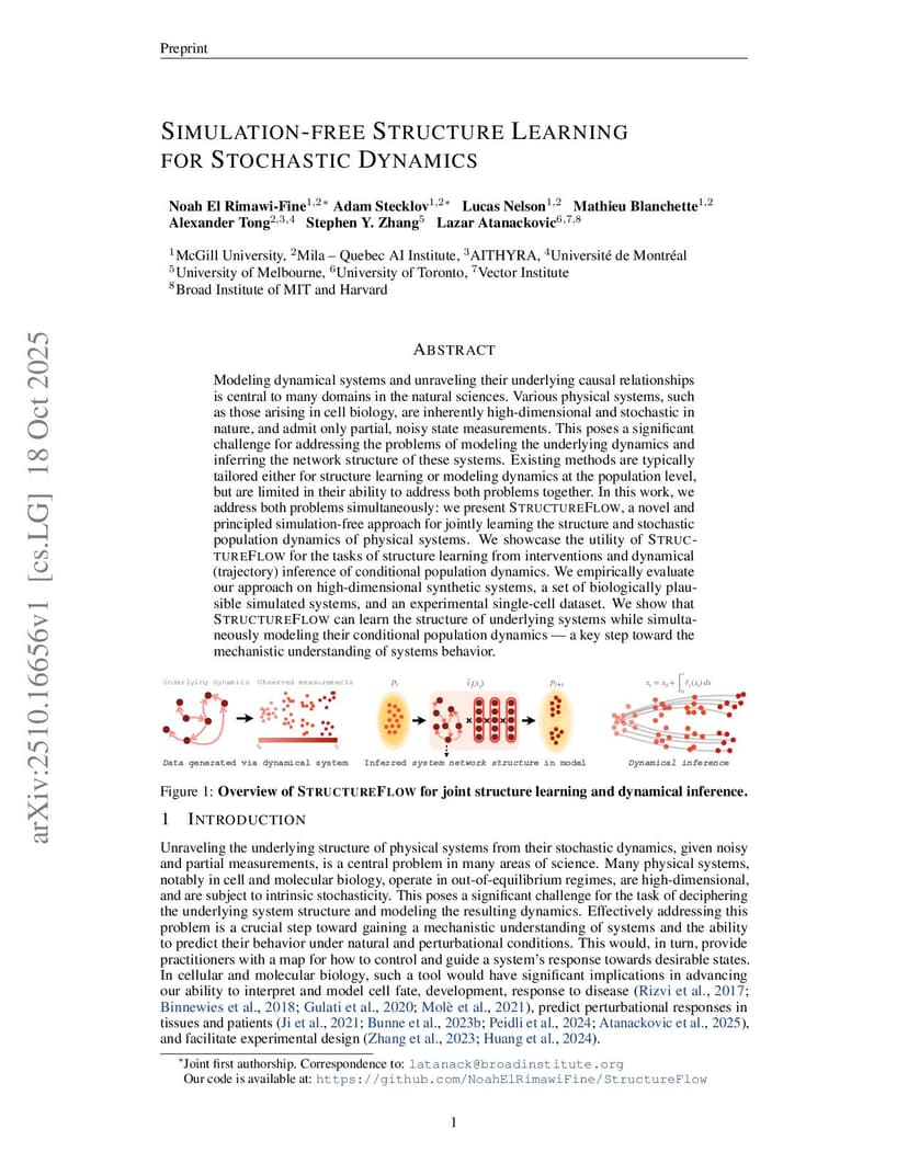 Modeling dynamical systems and unraveling their underlying causal relationships is central to many domains in the natural sciences. Various physical systems, such as those arising in cell biology, are inherently high-dimensional and stochastic in nature, and admit only partial, noisy state measurements. This poses a significant challenge for addressing the problems of modeling the underlying dynamics and inferring the network structure of these systems. Existing methods are typically tailored either for structure learning or modeling dynamics at the population level, but are limited in their ability to address both problems together. In this work, we address both problems simultaneously: we present StructureFlow, a novel and principled simulation-free approach for jointly learning the structure and stochastic population dynamics of physical systems. We showcase the utility of StructureFlow for the tasks of structure learning from interventions and dynamical (trajectory) inference of conditional population dynamics. We empirically evaluate our approach on high-dimensional synthetic systems, a set of biologically plausible simulated systems, and an experimental single-cell dataset. We show that StructureFlow can learn the structure of underlying systems while simultaneously modeling their conditional population dynamics -- a key step toward the mechanistic understanding of systems behavior.