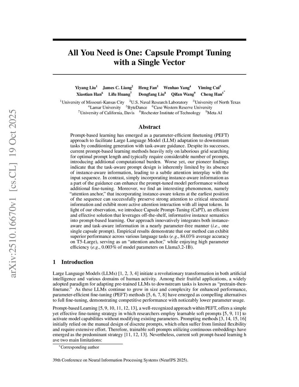 Prompt-based learning has emerged as a parameter-efficient finetuning (PEFT) approach to facilitate Large Language Model (LLM) adaptation to downstream tasks by conditioning generation with task-aware guidance. Despite its successes, current prompt-based learning methods heavily rely on laborious grid searching for optimal prompt length and typically require considerable number of prompts, introducing additional computational burden. Worse yet, our pioneer findings indicate that the task-aware prompt design is inherently limited by its absence of instance-aware information, leading to a subtle attention interplay with the input sequence. In contrast, simply incorporating instance-aware information as a part of the guidance can enhance the prompt-tuned model performance without additional fine-tuning. Moreover, we find an interesting phenomenon, namely "attention anchor", that incorporating instance-aware tokens at the earliest position of the sequence can successfully preserve strong attention to critical structural information and exhibit more active attention interaction with all input tokens. In light of our observation, we introduce Capsule Prompt-Tuning (CaPT), an efficient and effective solution that leverages off-the-shelf, informative instance semantics into prompt-based learning. Our approach innovatively integrates both instance-aware and task-aware information in a nearly parameter-free manner (i.e., one single capsule prompt). Empirical results demonstrate that our method can exhibit superior performance across various language tasks (e.g., 84.03\% average accuracy on T5-Large), serving as an "attention anchor," while enjoying high parameter efficiency (e.g., 0.003\% of model parameters on Llama3.2-1B).