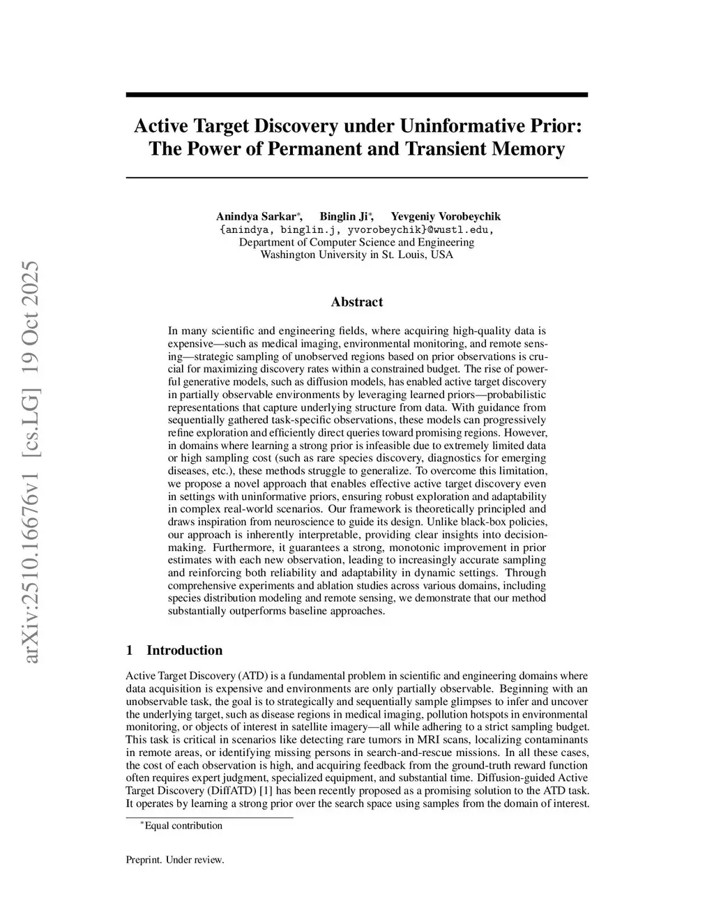 In many scientific and engineering fields, where acquiring high-quality data is expensive--such as medical imaging, environmental monitoring, and remote sensing--strategic sampling of unobserved regions based on prior observations is crucial for maximizing discovery rates within a constrained budget. The rise of powerful generative models, such as diffusion models, has enabled active target discovery in partially observable environments by leveraging learned priors--probabilistic representations that capture underlying structure from data. With guidance from sequentially gathered task-specific observations, these models can progressively refine exploration and efficiently direct queries toward promising regions. However, in domains where learning a strong prior is infeasible due to extremely limited data or high sampling cost (such as rare species discovery, diagnostics for emerging diseases, etc.), these methods struggle to generalize. To overcome this limitation, we propose a novel approach that enables effective active target discovery even in settings with uninformative priors, ensuring robust exploration and adaptability in complex real-world scenarios. Our framework is theoretically principled and draws inspiration from neuroscience to guide its design. Unlike black-box policies, our approach is inherently interpretable, providing clear insights into decision-making. Furthermore, it guarantees a strong, monotonic improvement in prior estimates with each new observation, leading to increasingly accurate sampling and reinforcing both reliability and adaptability in dynamic settings. Through comprehensive experiments and ablation studies across various domains, including species distribution modeling and remote sensing, we demonstrate that our method substantially outperforms baseline approaches.