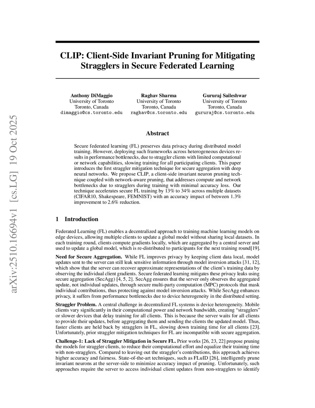Secure federated learning (FL) preserves data privacy during distributed model training. However, deploying such frameworks across heterogeneous devices results in performance bottlenecks, due to straggler clients with limited computational or network capabilities, slowing training for all participating clients. This paper introduces the first straggler mitigation technique for secure aggregation with deep neural networks. We propose CLIP, a client-side invariant neuron pruning technique coupled with network-aware pruning, that addresses compute and network bottlenecks due to stragglers during training with minimal accuracy loss. Our technique accelerates secure FL training by 13% to 34% across multiple datasets (CIFAR10, Shakespeare, FEMNIST) with an accuracy impact of between 1.3% improvement to 2.6% reduction.