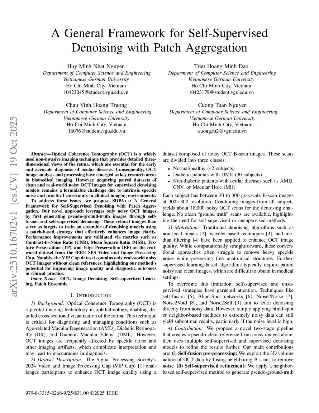 Optical Coherence Tomography (OCT) is a widely used non-invasive imaging technique that provides detailed three-dimensional views of the retina, which are essential for the early and accurate diagnosis of ocular diseases. Consequently, OCT image analysis and processing have emerged as key research areas in biomedical imaging. However, acquiring paired datasets of clean and real-world noisy OCT images for supervised denoising models remains a formidable challenge due to intrinsic speckle noise and practical constraints in clinical imaging environments. To address these issues, we propose SDPA++: A General Framework for Self-Supervised Denoising with Patch Aggregation. Our novel approach leverages only noisy OCT images by first generating pseudo-ground-truth images through self-fusion and self-supervised denoising. These refined images then serve as targets to train an ensemble of denoising models using a patch-based strategy that effectively enhances image clarity. Performance improvements are validated via metrics such as Contrast-to-Noise Ratio (CNR), Mean Square Ratio (MSR), Texture Preservation (TP), and Edge Preservation (EP) on the real-world dataset from the IEEE SPS Video and Image Processing Cup. Notably, the VIP Cup dataset contains only real-world noisy OCT images without clean references, highlighting our method's potential for improving image quality and diagnostic outcomes in clinical practice.