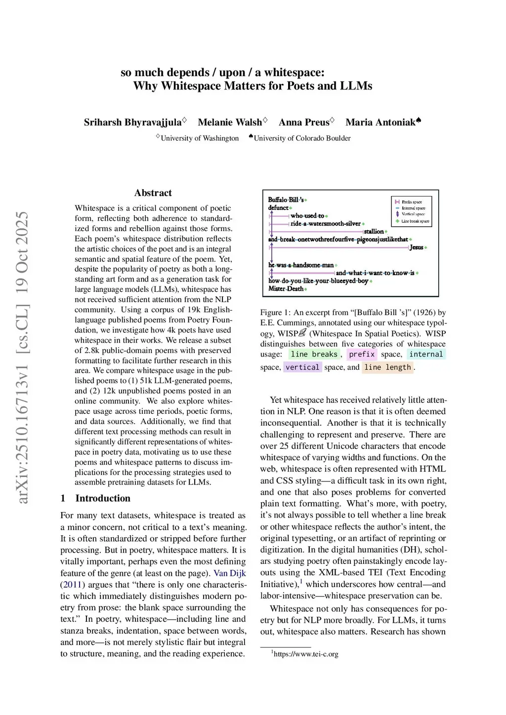 so much depends / upon / a whitespace: Why Whitespace Matters for Poets and LLMs