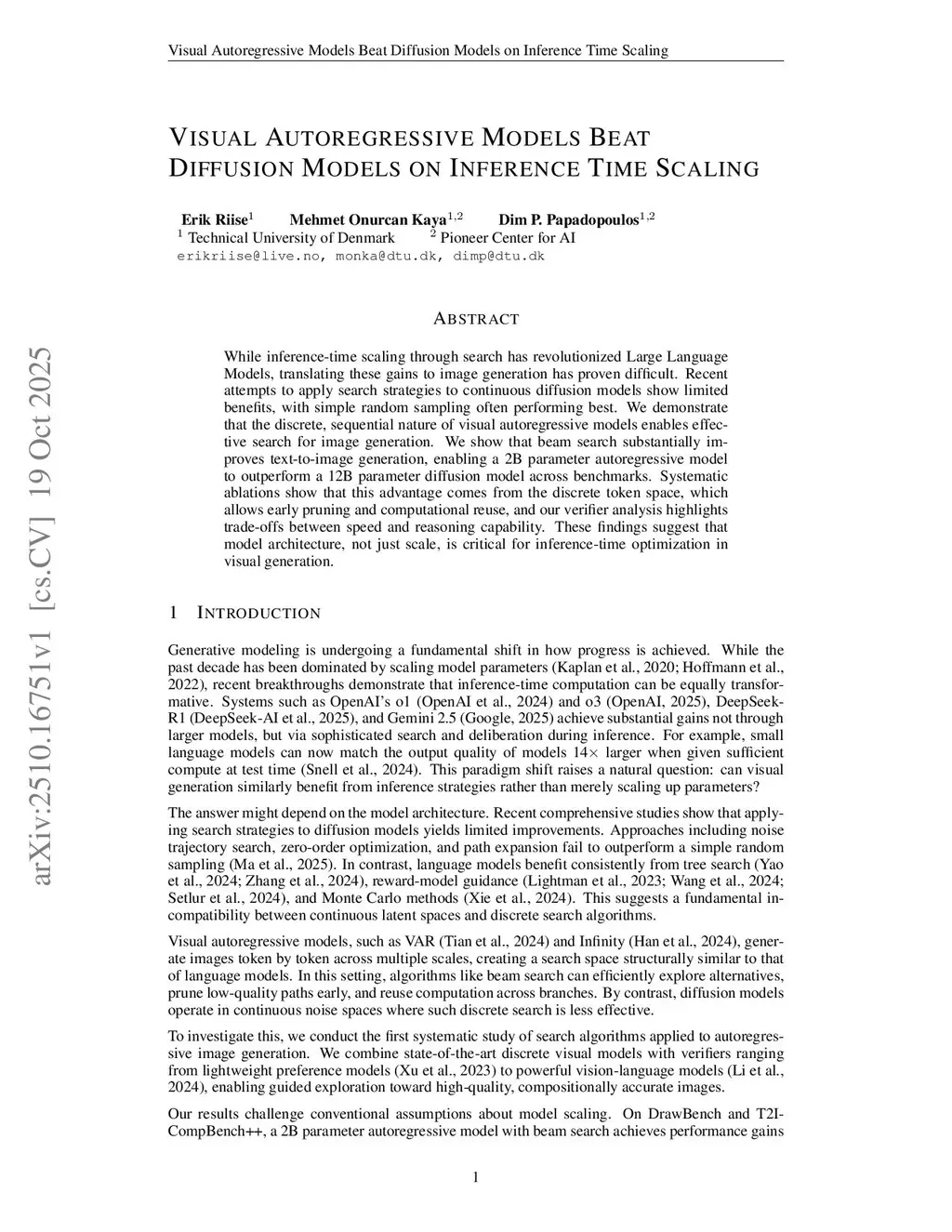 While inference-time scaling through search has revolutionized Large Language Models, translating these gains to image generation has proven difficult. Recent attempts to apply search strategies to continuous diffusion models show limited benefits, with simple random sampling often performing best. We demonstrate that the discrete, sequential nature of visual autoregressive models enables effective search for image generation. We show that beam search substantially improves text-to-image generation, enabling a 2B parameter autoregressive model to outperform a 12B parameter diffusion model across benchmarks. Systematic ablations show that this advantage comes from the discrete token space, which allows early pruning and computational reuse, and our verifier analysis highlights trade-offs between speed and reasoning capability. These findings suggest that model architecture, not just scale, is critical for inference-time optimization in visual generation.