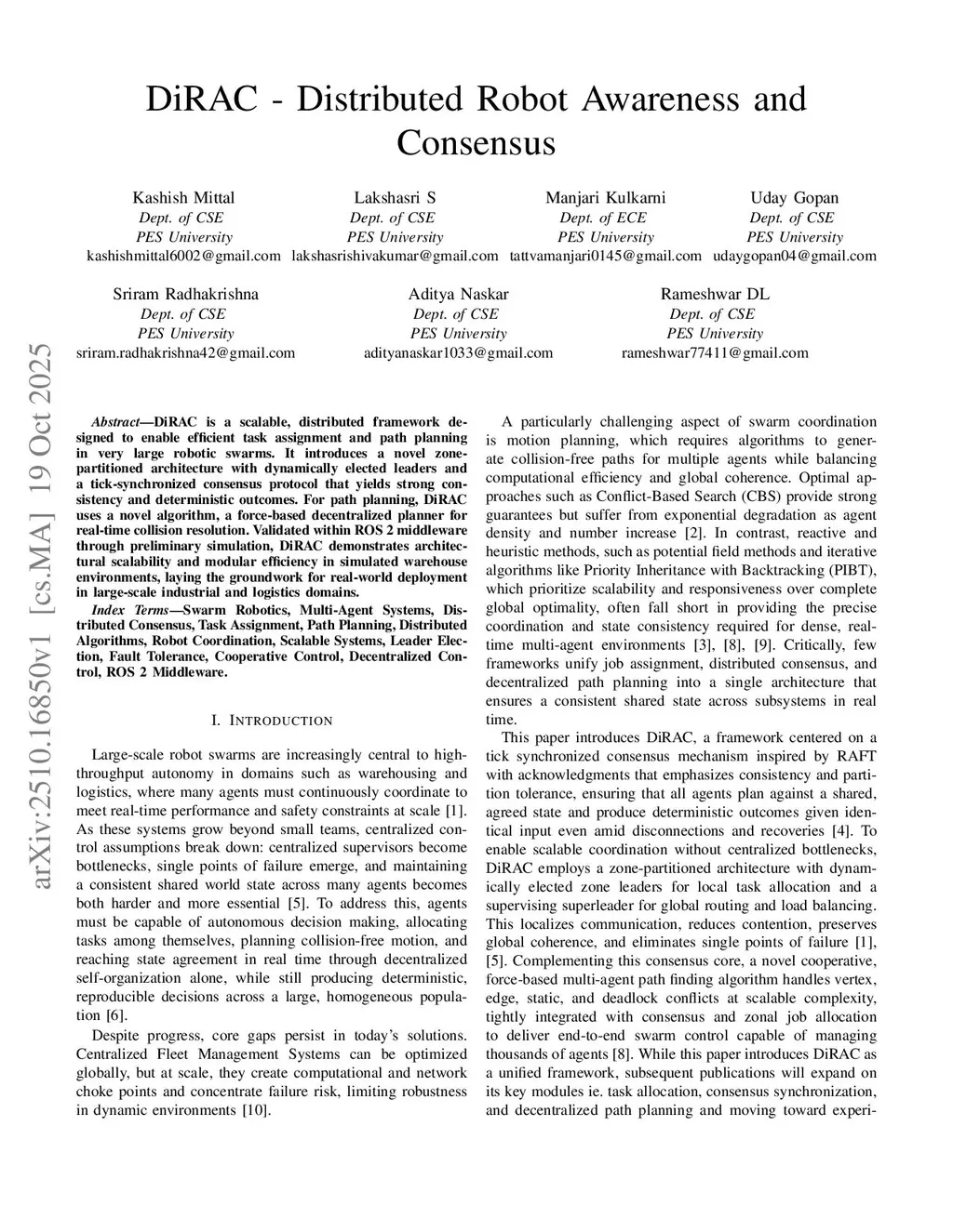 DiRAC is a scalable, distributed framework designed to enable efficient task assignment and path planning in very large robotic swarms. It introduces a novel zone-partitioned architecture with dynamically elected leaders and a tick-synchronized consensus protocol that yields strong consistency and deterministic outcomes. For path planning, DiRAC uses a novel algorithm, a force-based decentralized planner for real-time collision resolution. Validated within ROS 2 middleware through preliminary simulation, DiRAC demonstrates architectural scalability and modular efficiency in simulated warehouse environments, laying the groundwork for real-world deployment in large-scale industrial and logistics domains.