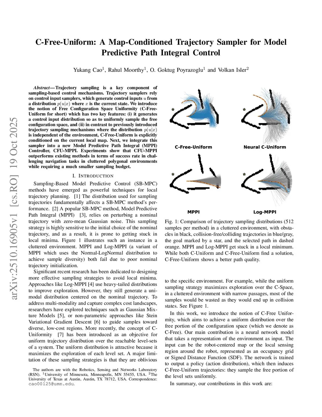 Trajectory sampling is a key component of sampling-based control mechanisms. Trajectory samplers rely on control input samplers, which generate control inputs u from a distribution p(u | x) where x is the current state. We introduce the notion of Free Configuration Space Uniformity (C-Free-Uniform for short) which has two key features: (i) it generates a control input distribution so as to uniformly sample the free configuration space, and (ii) in contrast to previously introduced trajectory sampling mechanisms where the distribution p(u | x) is independent of the environment, C-Free-Uniform is explicitly conditioned on the current local map. Next, we integrate this sampler into a new Model Predictive Path Integral (MPPI) Controller, CFU-MPPI. Experiments show that CFU-MPPI outperforms existing methods in terms of success rate in challenging navigation tasks in cluttered polygonal environments while requiring a much smaller sampling budget.