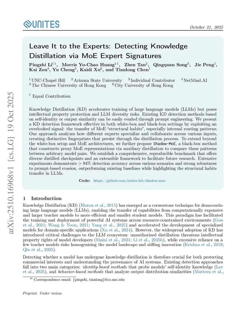 Knowledge Distillation (KD) accelerates training of large language models (LLMs) but poses intellectual property protection and LLM diversity risks. Existing KD detection methods based on self-identity or output similarity can be easily evaded through prompt engineering. We present a KD detection framework effective in both white-box and black-box settings by exploiting an overlooked signal: the transfer of MoE "structural habits", especially internal routing patterns. Our approach analyzes how different experts specialize and collaborate across various inputs, creating distinctive fingerprints that persist through the distillation process. To extend beyond the white-box setup and MoE architectures, we further propose Shadow-MoE, a black-box method that constructs proxy MoE representations via auxiliary distillation to compare these patterns between arbitrary model pairs. We establish a comprehensive, reproducible benchmark that offers diverse distilled checkpoints and an extensible framework to facilitate future research. Extensive experiments demonstrate >94% detection accuracy across various scenarios and strong robustness to prompt-based evasion, outperforming existing baselines while highlighting the structural habits transfer in LLMs.