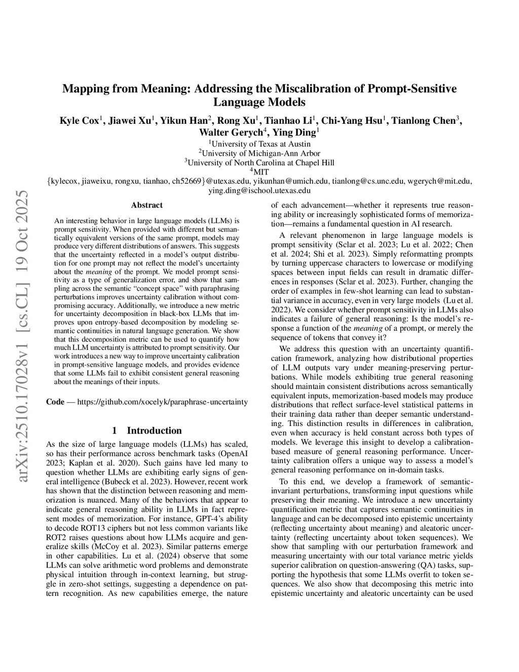 An interesting behavior in large language models (LLMs) is prompt sensitivity. When provided with different but semantically equivalent versions of the same prompt, models may produce very different distributions of answers. This suggests that the uncertainty reflected in a model's output distribution for one prompt may not reflect the model's uncertainty about the meaning of the prompt. We model prompt sensitivity as a type of generalization error, and show that sampling across the semantic ``concept space'' with paraphrasing perturbations improves uncertainty calibration without compromising accuracy. Additionally, we introduce a new metric for uncertainty decomposition in black-box LLMs that improves upon entropy-based decomposition by modeling semantic continuities in natural language generation. We show that this decomposition metric can be used to quantify how much LLM uncertainty is attributed to prompt sensitivity. Our work introduces a new way to improve uncertainty calibration in prompt-sensitive language models, and provides evidence that some LLMs fail to exhibit consistent general reasoning about the meanings of their inputs.