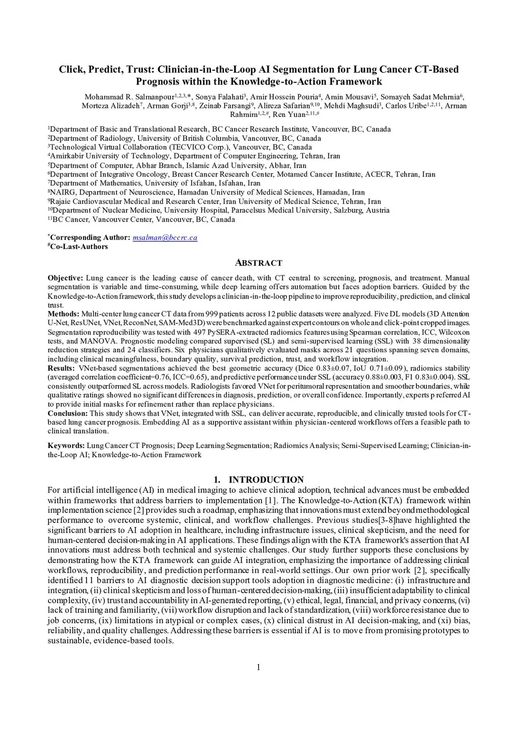 Lung cancer remains the leading cause of cancer mortality, with CT imaging central to screening, prognosis, and treatment. Manual segmentation is variable and time-intensive, while deep learning (DL) offers automation but faces barriers to clinical adoption. Guided by the Knowledge-to-Action framework, this study develops a clinician-in-the-loop DL pipeline to enhance reproducibility, prognostic accuracy, and clinical trust. Multi-center CT data from 999 patients across 12 public datasets were analyzed using five DL models (3D Attention U-Net, ResUNet, VNet, ReconNet, SAM-Med3D), benchmarked against expert contours on whole and click-point cropped images. Segmentation reproducibility was assessed using 497 PySERA-extracted radiomic features via Spearman correlation, ICC, Wilcoxon tests, and MANOVA, while prognostic modeling compared supervised (SL) and semi-supervised learning (SSL) across 38 dimensionality reduction strategies and 24 classifiers. Six physicians qualitatively evaluated masks across seven domains, including clinical meaningfulness, boundary quality, prognostic value, trust, and workflow integration. VNet achieved the best performance (Dice = 0.83, IoU = 0.71), radiomic stability (mean correlation = 0.76, ICC = 0.65), and predictive accuracy under SSL (accuracy = 0.88, F1 = 0.83). SSL consistently outperformed SL across models. Radiologists favored VNet for peritumoral representation and smoother boundaries, preferring AI-generated initial masks for refinement rather than replacement. These results demonstrate that integrating VNet with SSL yields accurate, reproducible, and clinically trusted CT-based lung cancer prognosis, highlighting a feasible path toward physician-centered AI translation.
